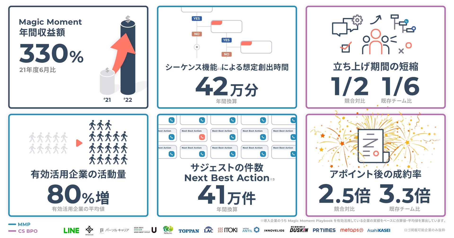 営業AI行動システム『Magic Moment Playbook』は、LTV にもとづいた営業活動を支援するサービスです。2021年1月の正式リリース以来、大手企業を中心にさまざまな業界で導入が進み、営業担当の皆様の日々の活動をより実りあるものにする為に、行動提案、その結果の活動量増加や時間短縮に寄与しています。