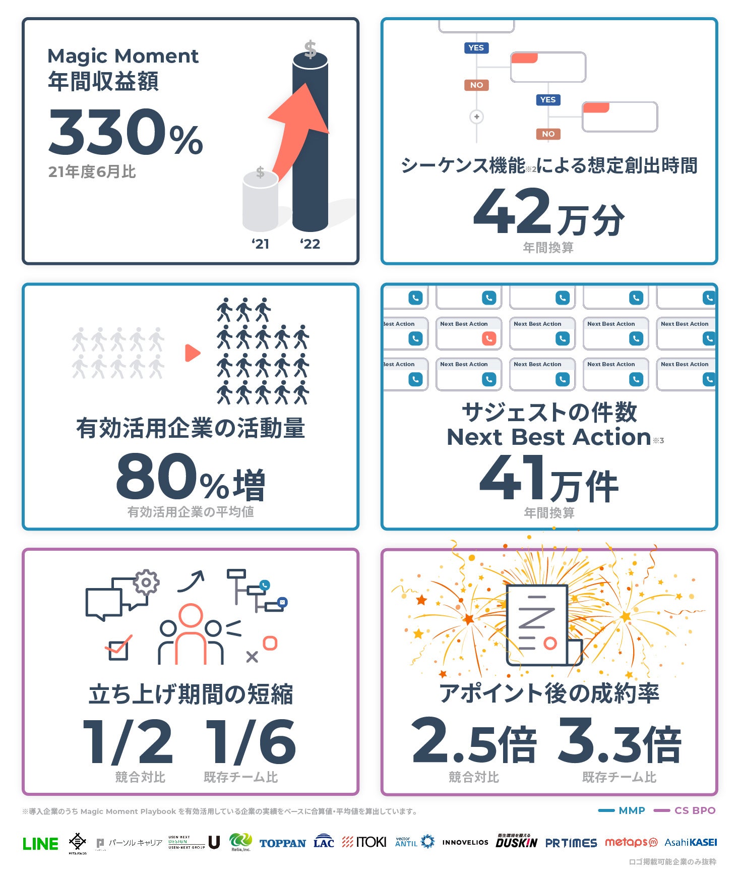 また当社では、単なるシステム提供にとどまらず、お客様企業の組織内から、営業変革を推進する『カスタマーサクセスBPO』を提供しています。本サービスの特徴は、営業現場にハンズオンでアプローチできることであり、当社の社員がお客様の営業組織に入り込み、Magic Moment Playbook を活用しながら一緒に営業活動を行います。結果、素早いチームの立上げや規模拡大、成約率の向上に貢献しております。