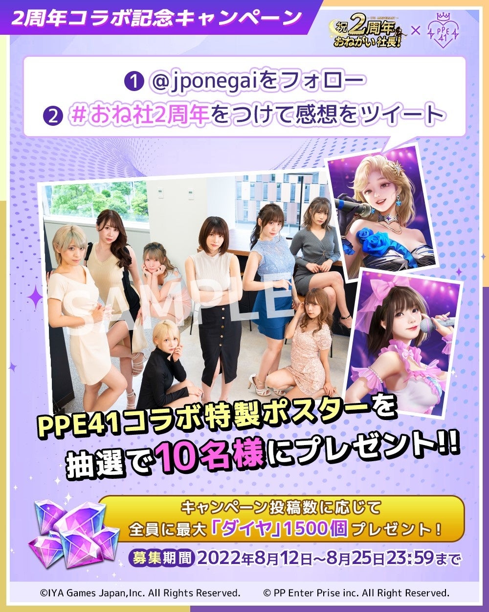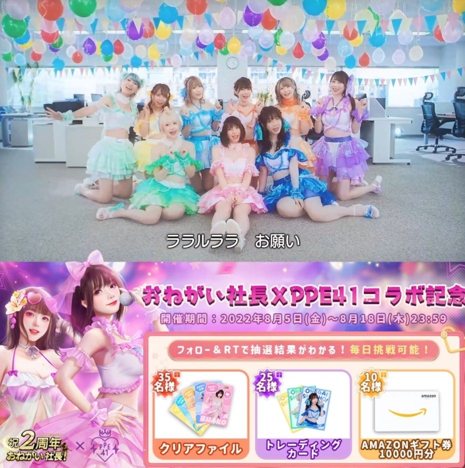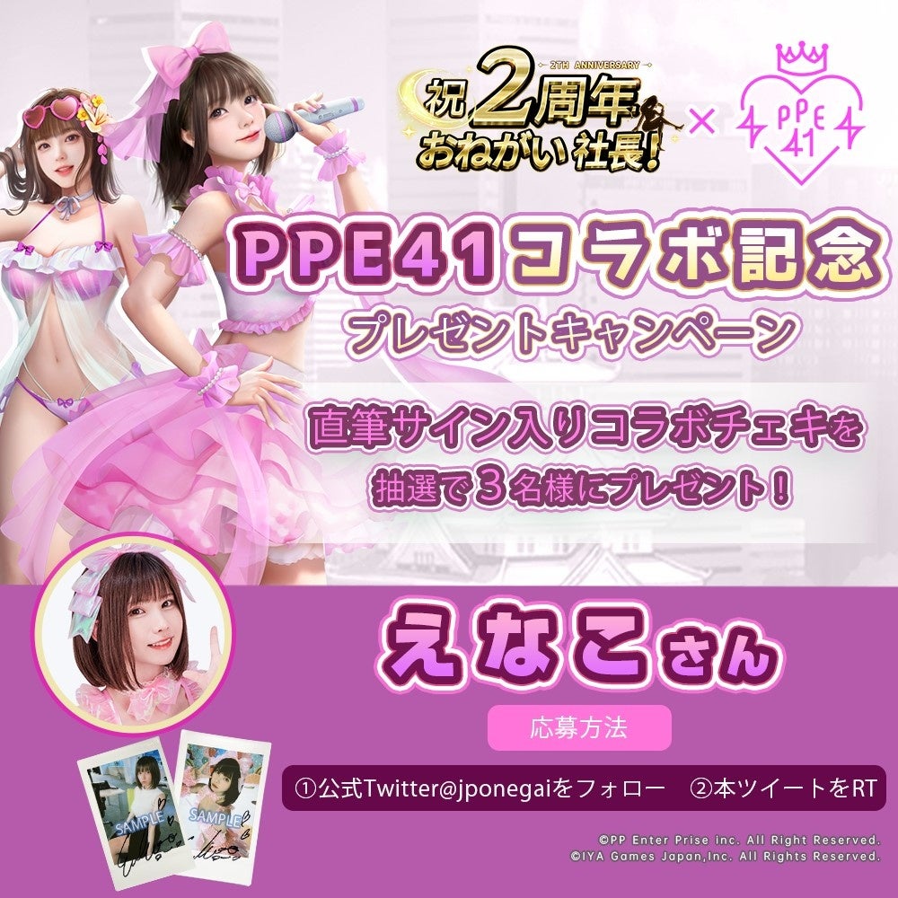 IYAGAMESが贈る、会社経営シミュレーションスマホゲーム『おねがい社長』が遂にリリース2周年を迎え、えなこ・伊織もえ・篠崎こころなどの人気コスプレイヤー達により結成されたアイドルグループ『PPE41』とコラボします!ゲーム内及び公式Twitterアカウントにて開催されるイベントも盛りだくさん!ぜひ、お見逃しなく!