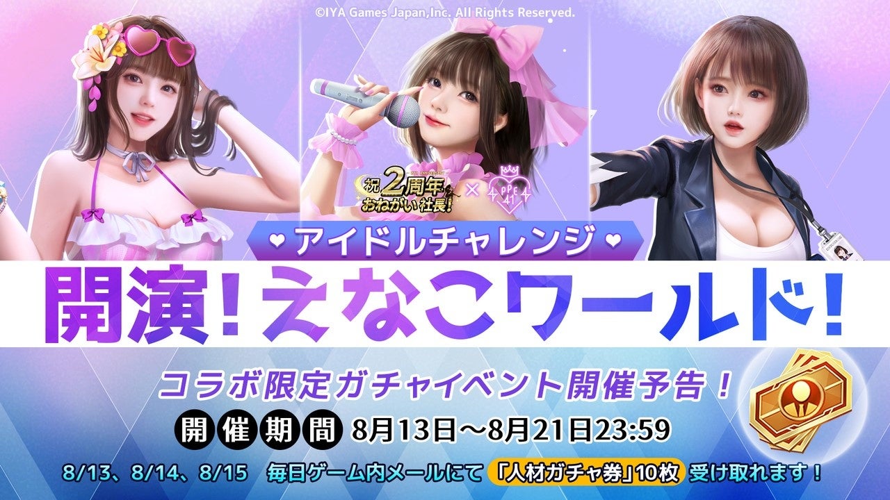 人気スマホゲーム『おねがい社長』2周年記念、まだまだこれから!人気コスプレイヤーの「えなこ」さんが本日からゲーム内に登場!