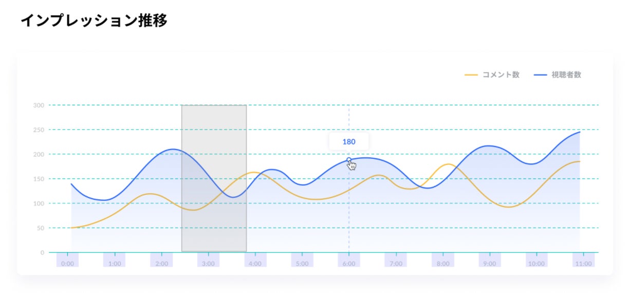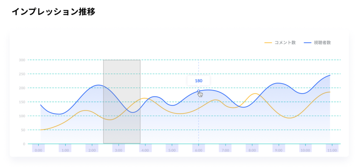 3秒毎のインプレッション推移を取得でき、どのコンテンツで離脱したか、もしくはエンゲージメントが上がったかを確認することが可能です。