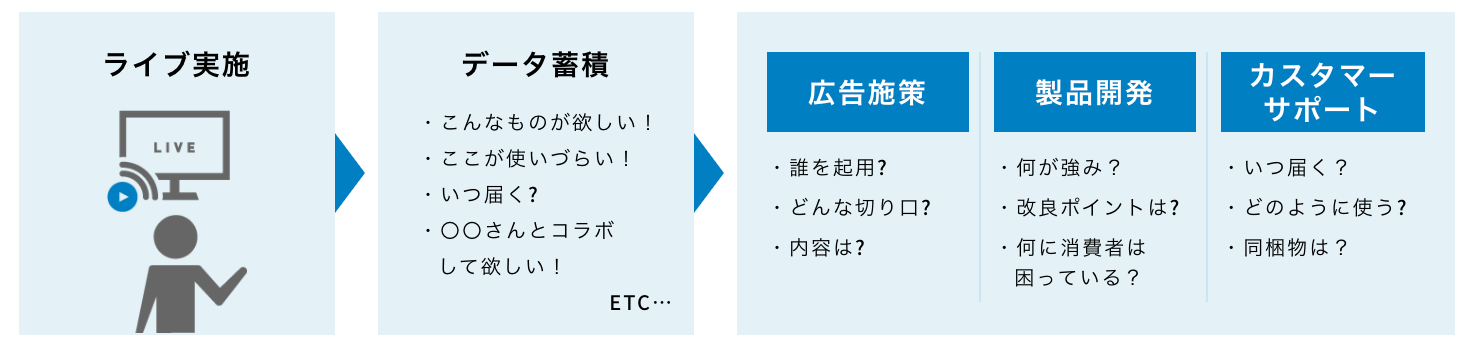 クライアントからニーズを聞き取り、全体のプランニング・進行管理などを行うだけで無く、目的に応じたプラットフォームの選定、出演するタレント・インフルエンサーのダイレクトキャスティング、視聴導線・購買導線の設計によって、「ターゲットが見にきたくなるライブ」「ターゲットが購入したくなるライブ」を実現します。
