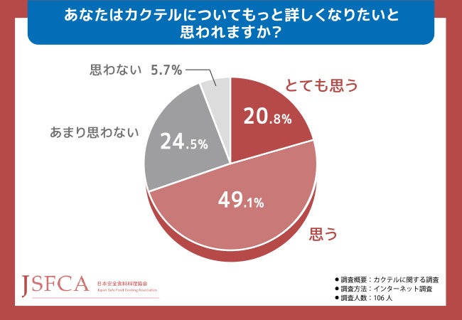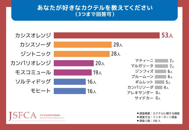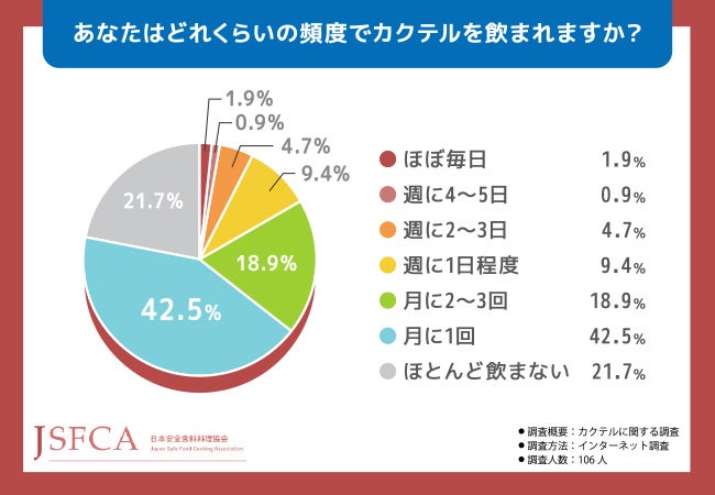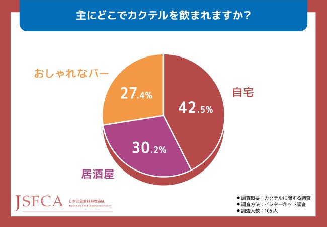 そこで今回、カクテルソムリエ資格認定試験(https://www.asc-jp.com/osake/cocktail/)を主催する日本安全食料料理協会(本社所在地:東京都港区)は、全国20〜60代の男女106名を対象に「カクテル」に関する調査を実施しました。
