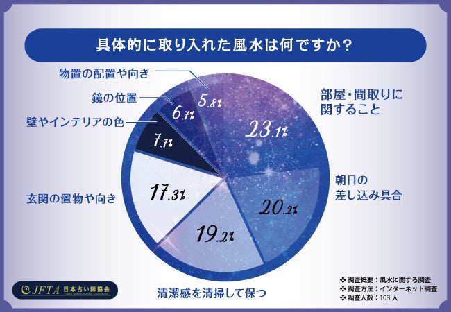 そこで今回、風水セラピスト資格認定試験(https://www.uranai.org/fengshui/)を主催する日本占い師協会(https://www.uranai.org/)は、全国の男女103名を対象に『風水』に関するアンケートを実施しました。