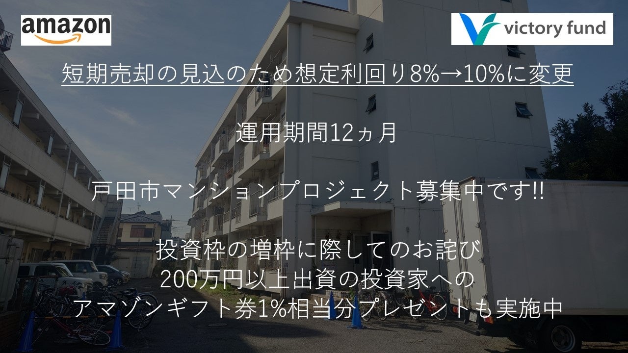 「victory fund」 第13号戸田市マンションプロジェクトにてアマゾンギフト券プレゼントキャンペーンの実施と想定利回りの変更(8%→10%)のお知らせ