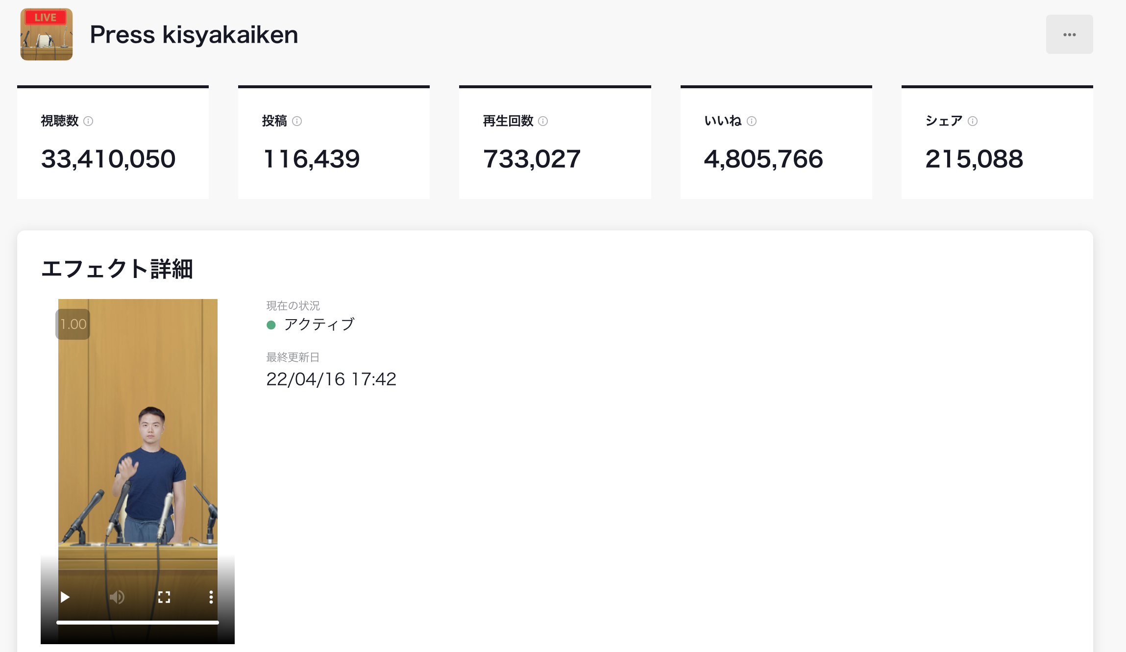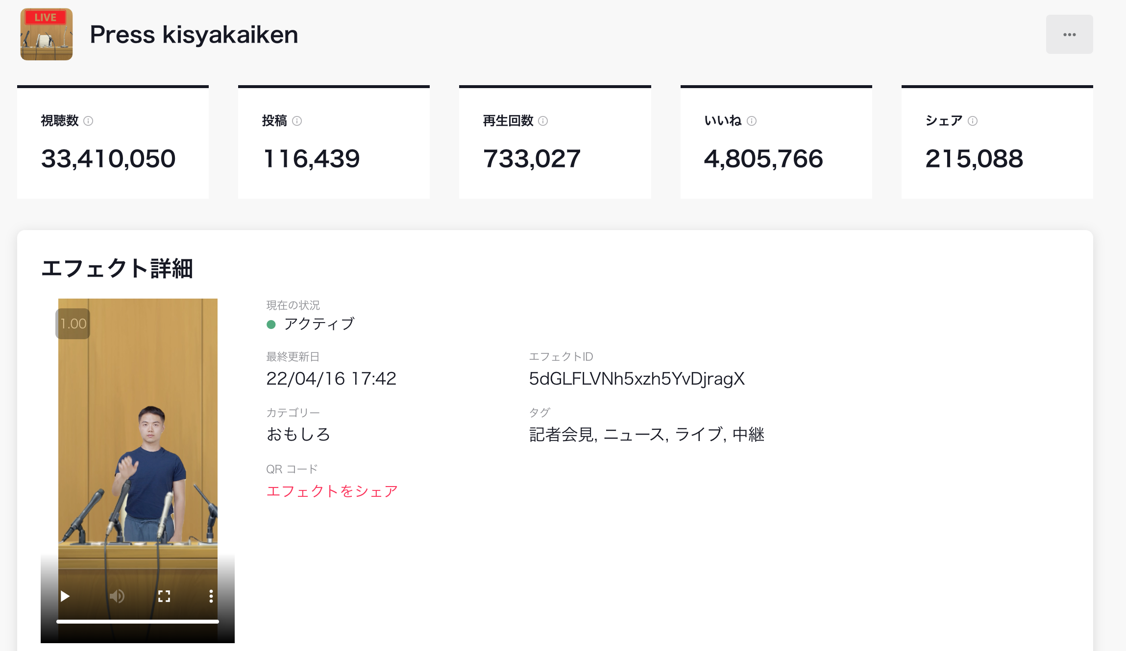 - 1⽇で視聴回数が約1300万回数を稼いだエフェクトも