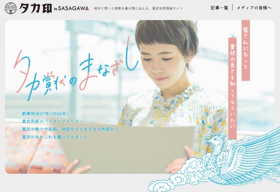 今回の「第2回 思い出の賞状コンテスト」は、賞状の深い魅力を多くの人に知ってもらうための情報サイト「タカ賞状のまなざし」からの派生イベントとなります。当サイトではササガワ社員から賞状を募集したイベントのことや、子供の成長のために賞状を活用する小学校の先生へのインタビュー記事、様々な場所へ表彰しに行くレポート、賞状に関する知識など記事にして、賞状や表彰に関わる色々な情報をお届けしています。