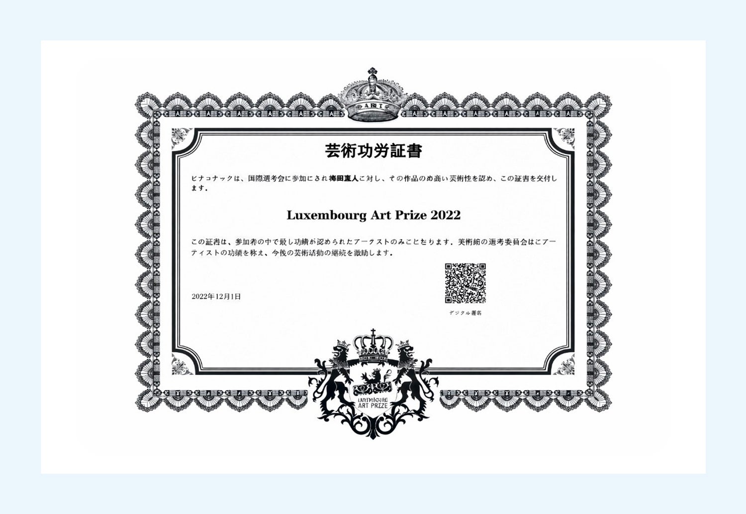 ・国際的な評価と技術的価値を併せ持つ、希少性の高いデジタル賞状。