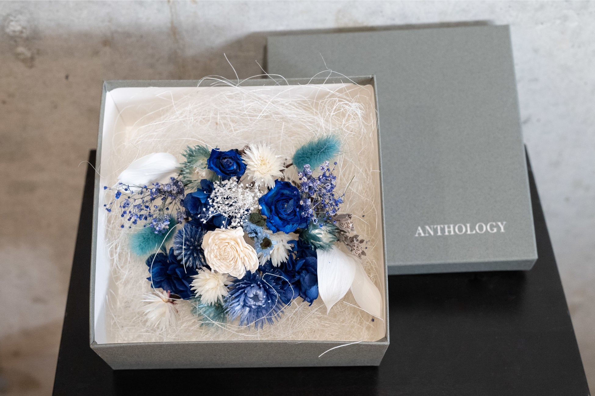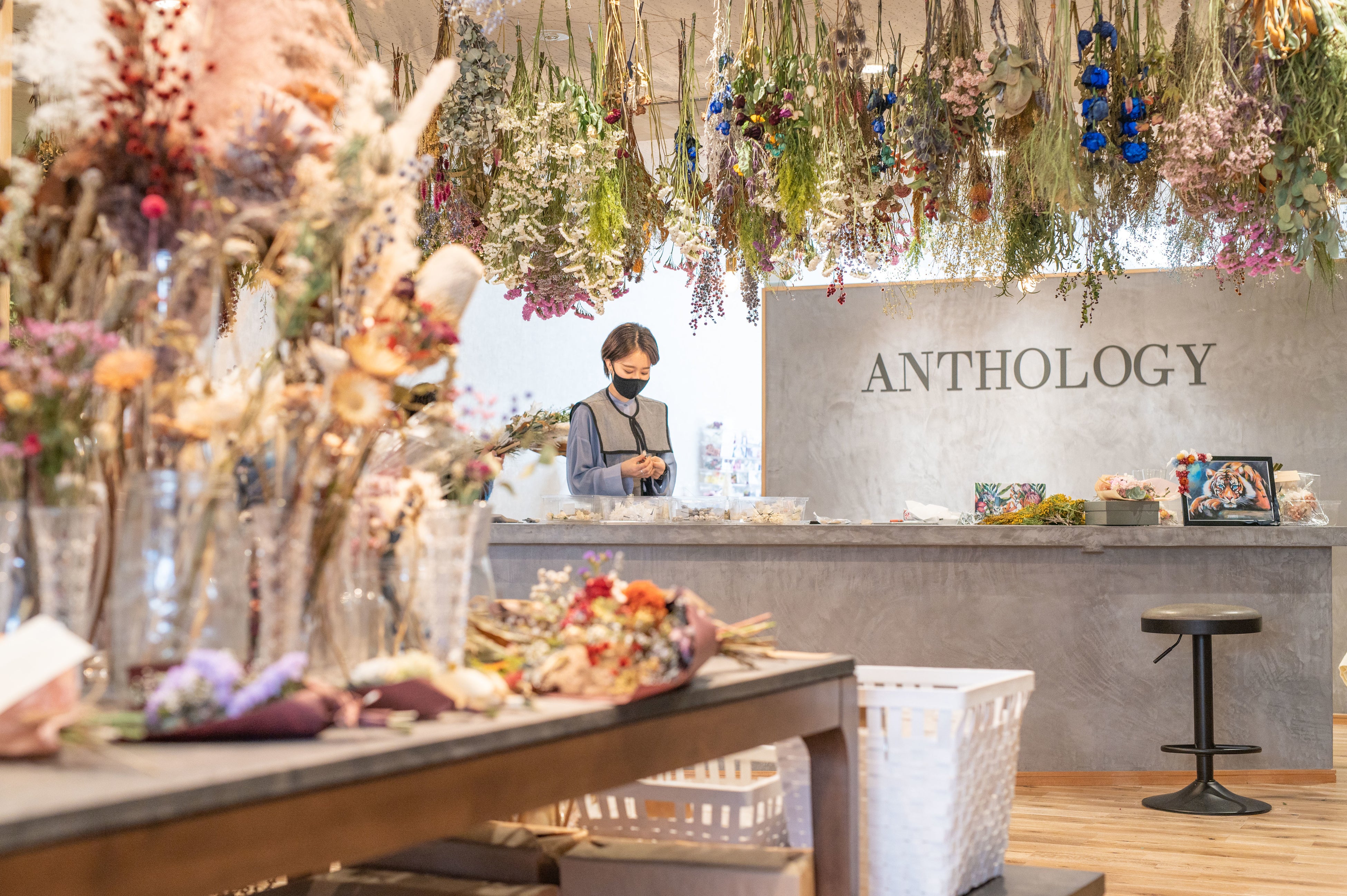 ANTHOLOGYでは自社乾燥の色味の強く残ったドライフラワーや、より色持ちや しなやかさを兼ね備えたプリザーブドフラワーを多用しているので、デザインや表現の幅が広いのが特徴です。