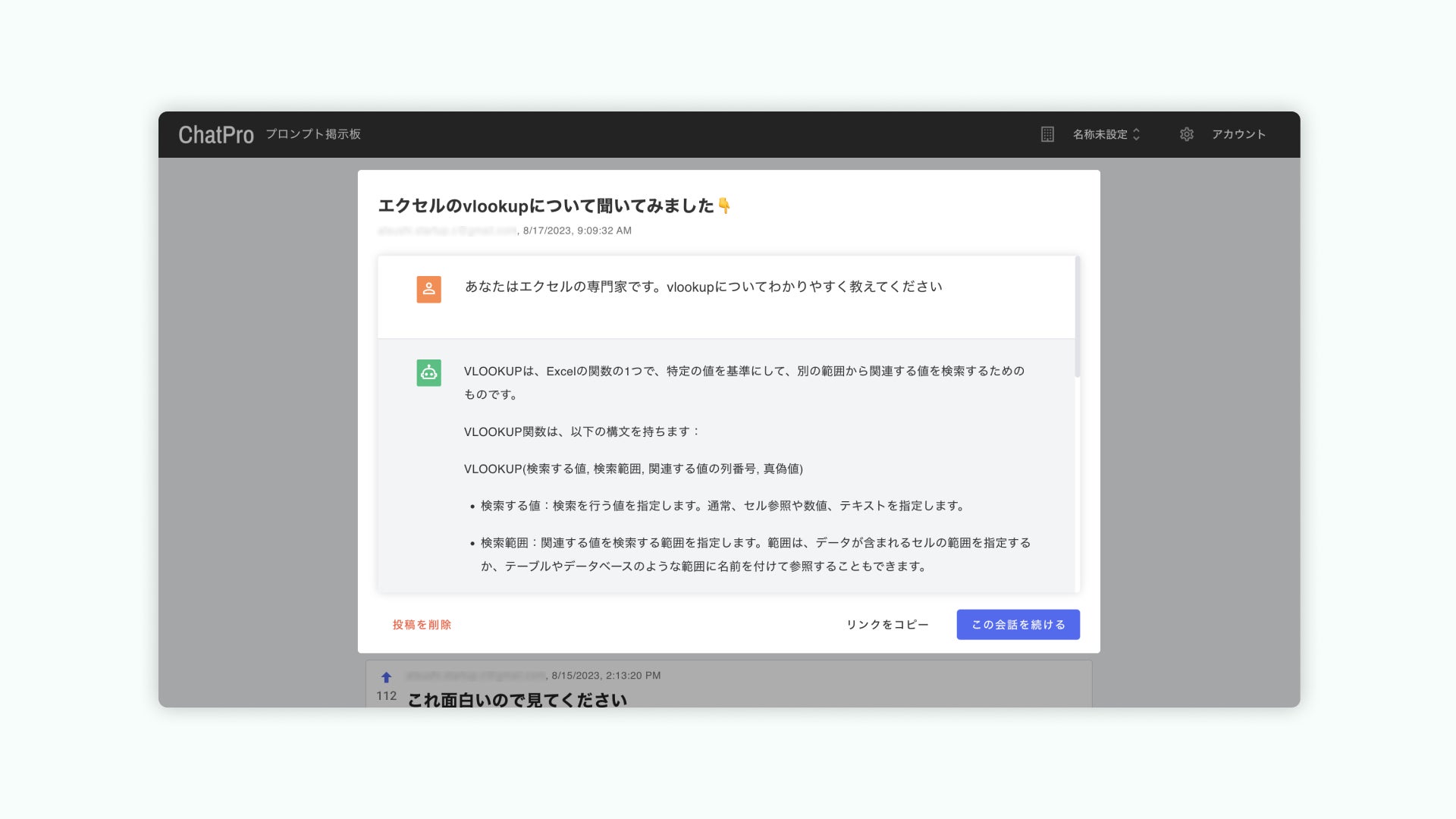 それぞれの投稿には「この会話を続ける」ボタンがついており、このボタンを押すことで、良い活用事例をそのまま、自分のアカウントで利用することができます。そのままの状態から会話をスタートすることもできる上、編集してさらなるアレンジを加えることもできます。