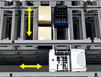 「T-AstroX」は、搬送台車が単独で床と棚間を自在に走行するマテハンシステムです。入庫から保管、出庫、ピッキングまで幅広い工程を担うことが可能です。