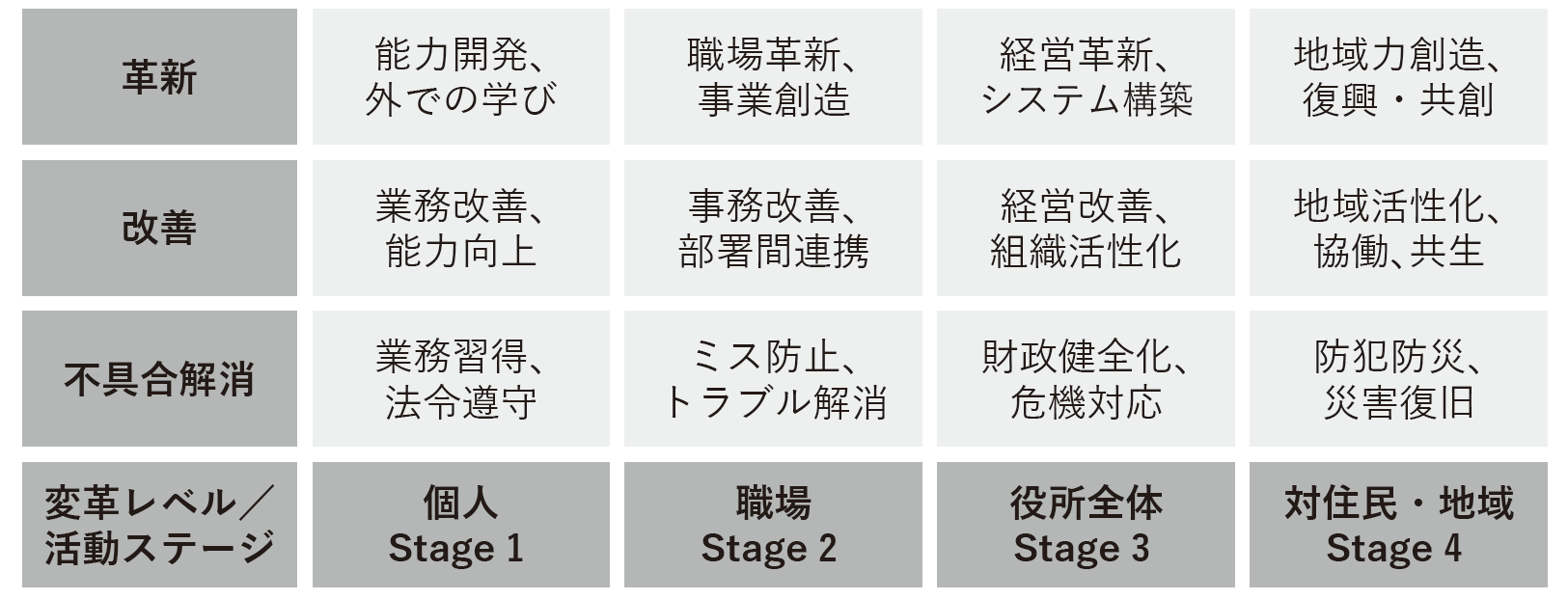 本書では、職員・組織がそれぞれに置かれた状況により、問題解決には不具合解消・改善・革新といった、「変革」のレベルをつかむ必要があるとする。さらに、時代の変化の中で、変革の対象範囲が変わってきていることにも着目し、個人・組織がどう「越境」して対応にあたればよいのか、活動のステージを示す。そのうえで、変革×越境の状況ごとに発揮すべき新しい改善力を「進化力」として説明。