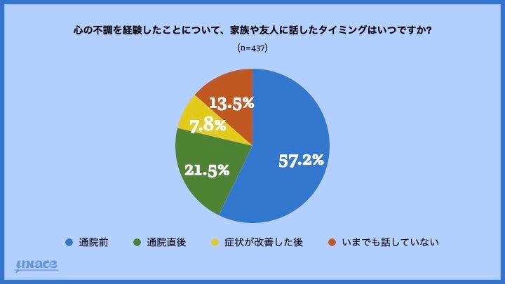 約9割(86.5%)は家族や友人へ心の不調について話していると回答し、約6割(57.2%)が通院前に共有しているとの結果に。年齢で大きな差はなく、30代が65.1%と最も高い数値となりました。