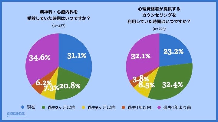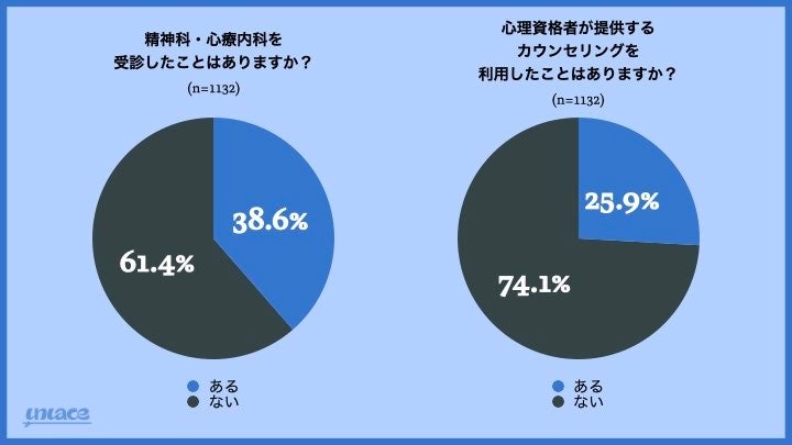 全体の約4割(38.6%)が精神科や心療内科の利用経験があり、全体の25%が過去1年以内に受診しているとの結果に。男女差はほとんどなく、20代は約半数(47.8%)が受診経験ありと回答しています。