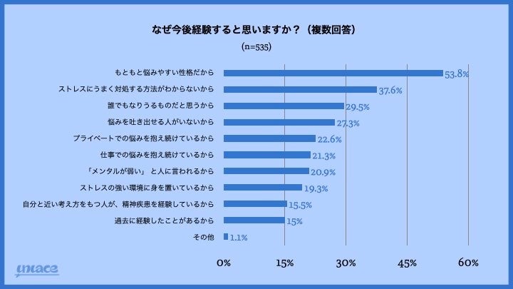 経験すると思うトップの理由は「悩みやすい性格」「ストレスにうまく対処する方法が分からない」「誰でもなり得るものだと思う」という結果になりました。