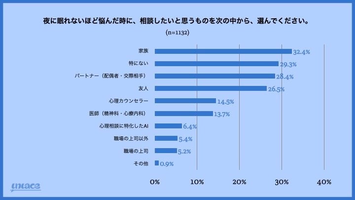 夜に眠れないほど悩んだ時に相談したい相手のトップは「家族」「特にない」「パートナー」という結果になりました。