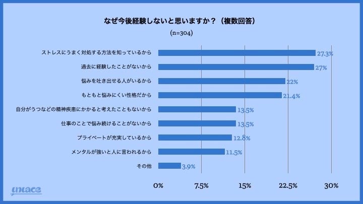 経験しないと思うトップの理由は「ストレスにうまく対処する方法を知っているから」「過去に経験したことがないから」「悩みを吐き出せる人がいるから」という結果になりました。