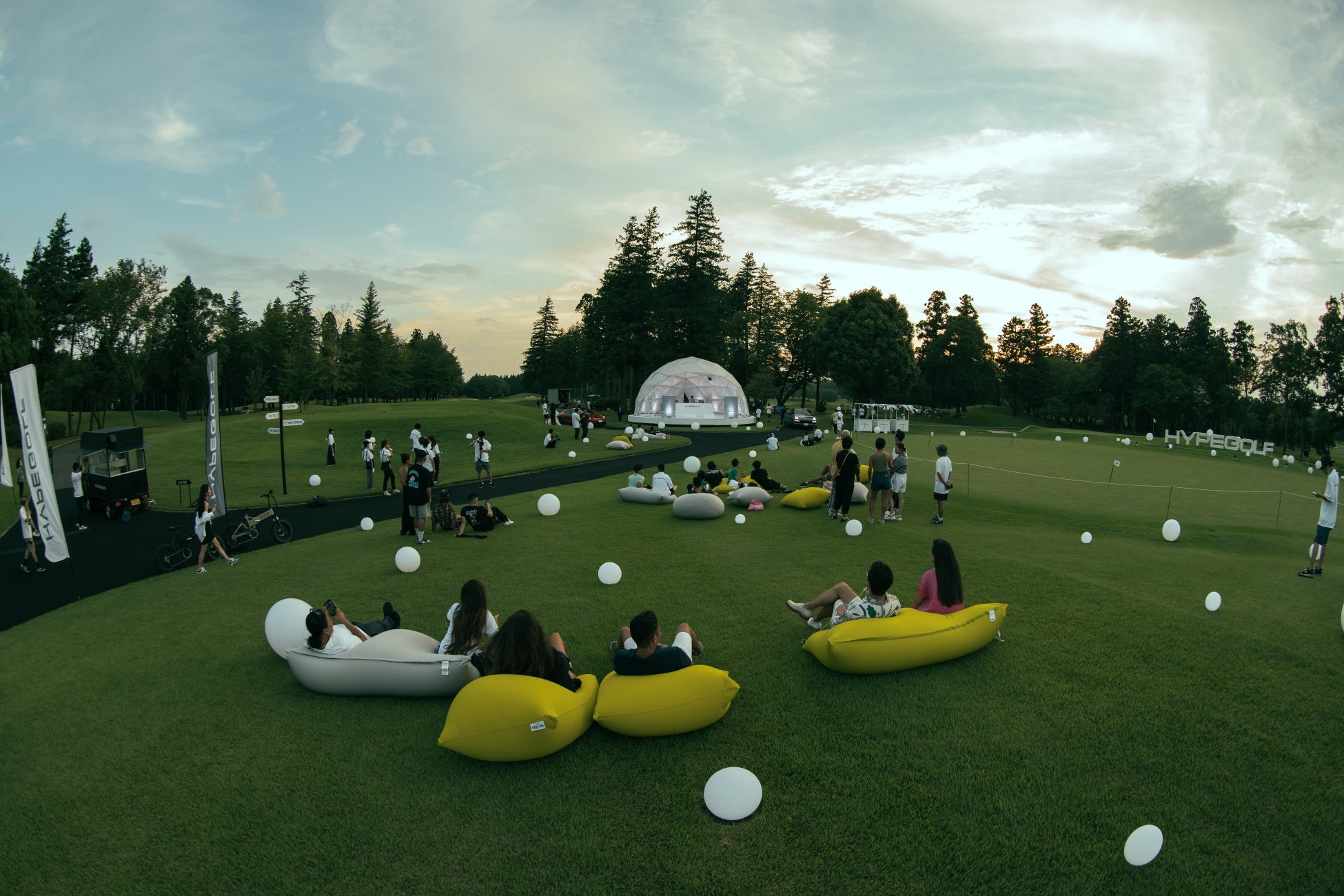 そして、会場はゴルフに興じるだけでなく、日本のバンド Mighty Crownによる音楽ライブも行われました。レゲエの異種格闘技戦として知られるこのライブは、360度ドーム型のステージで行われ、ゴルフコースはゴルフボールと共鳴する球体ライトで照らされました。