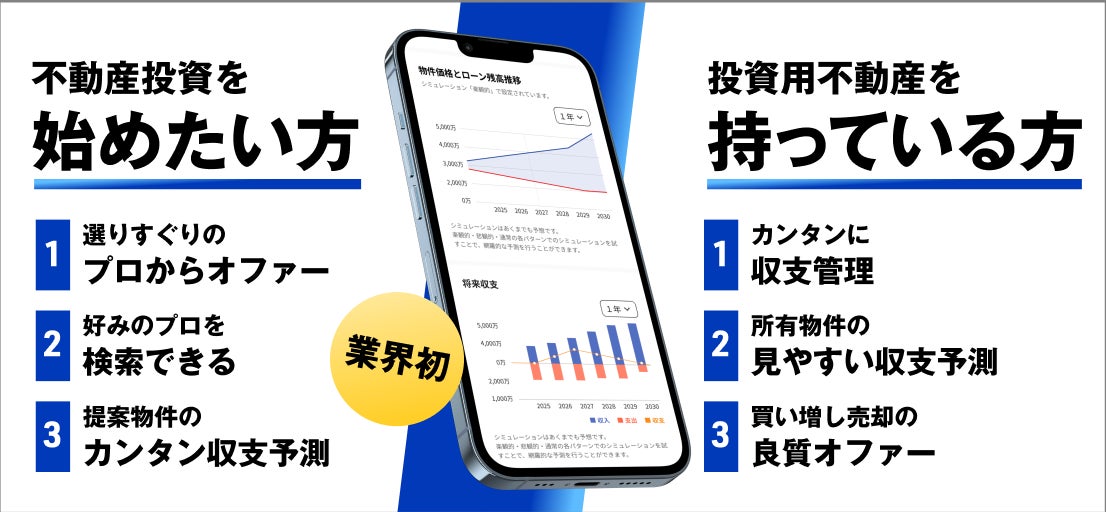 投資家向けアプリ「Propally」は、物件の検討から購入、収支管理、売却までをスマホ一つで完結させ、収支シミュレーションや、最適なプロとのマッチングなどワンストップでサポート。