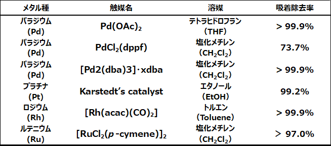 「CPs-HP50」は、希少な貴金属であるパラジウム(Pd)やプラチナ(Pt)、ロジウム(Rh)、Ru(ルテニウム)等が含まれた、トルエンや塩化メチレン、エタノールなどの有機溶媒からの吸着除去を高効率で行うことが可能です。