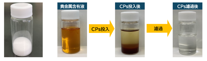 また、その他農薬、電子材料等のファインケミカル関連の製造工程における貴金属リサイクルに適用が可能であり、希少な貴金属の資源循環と再利用による低コスト化に貢献可能な製品です。