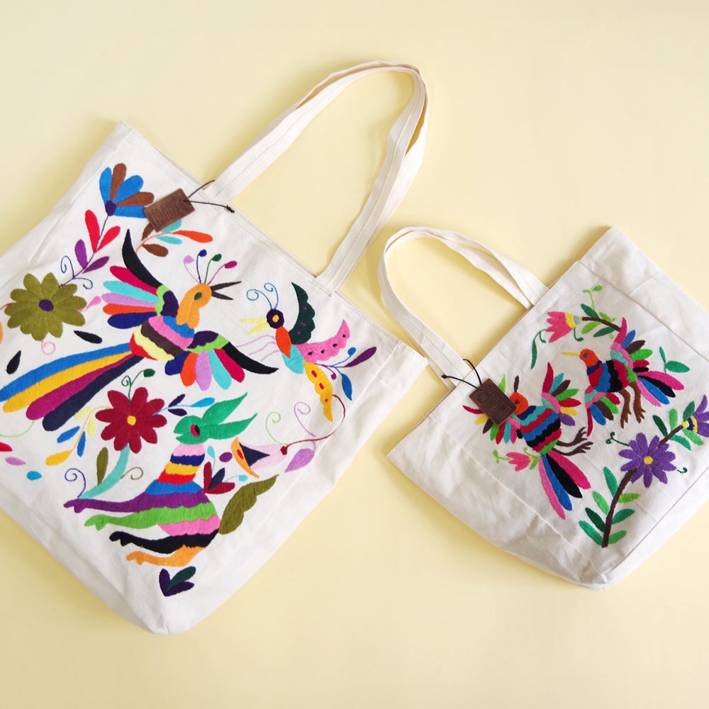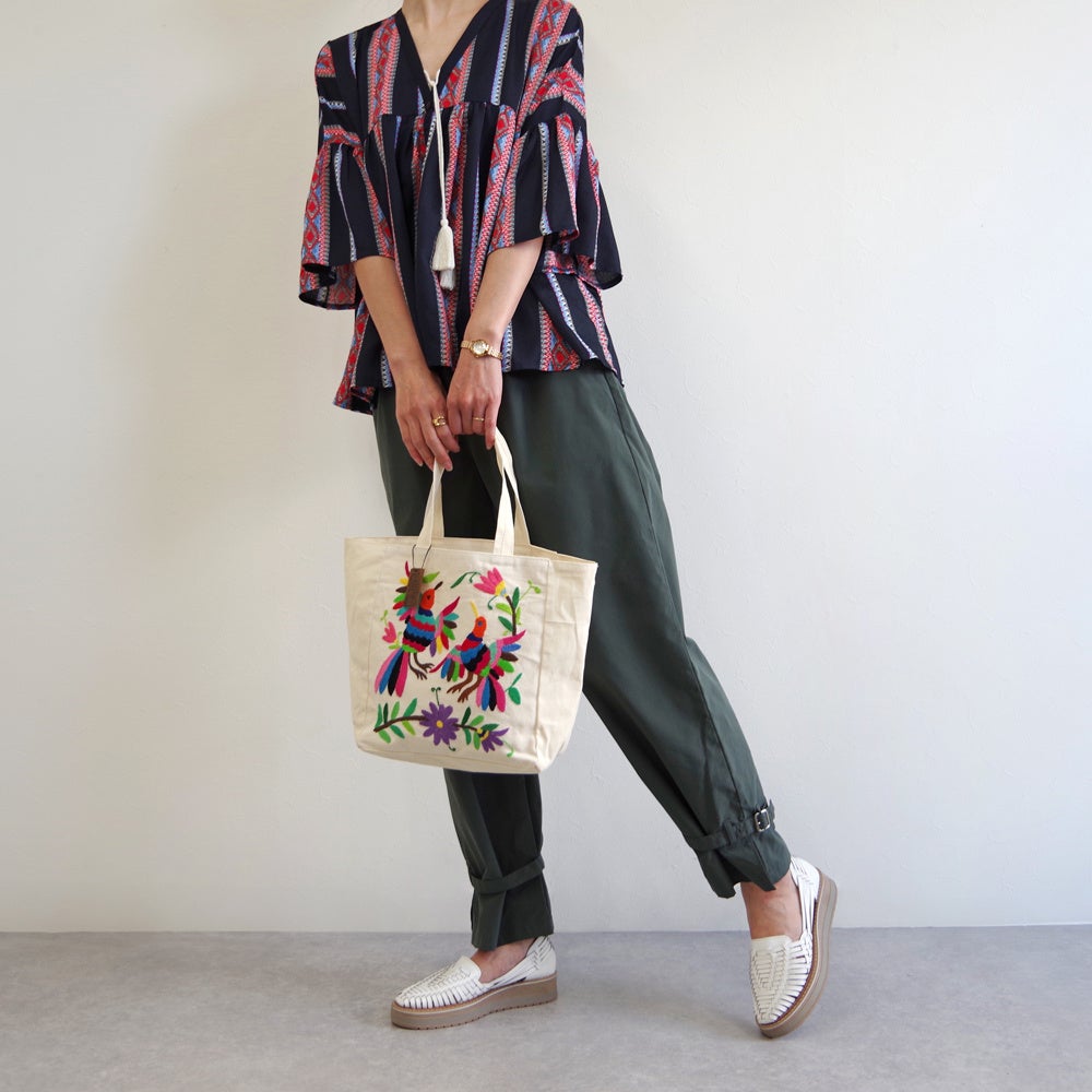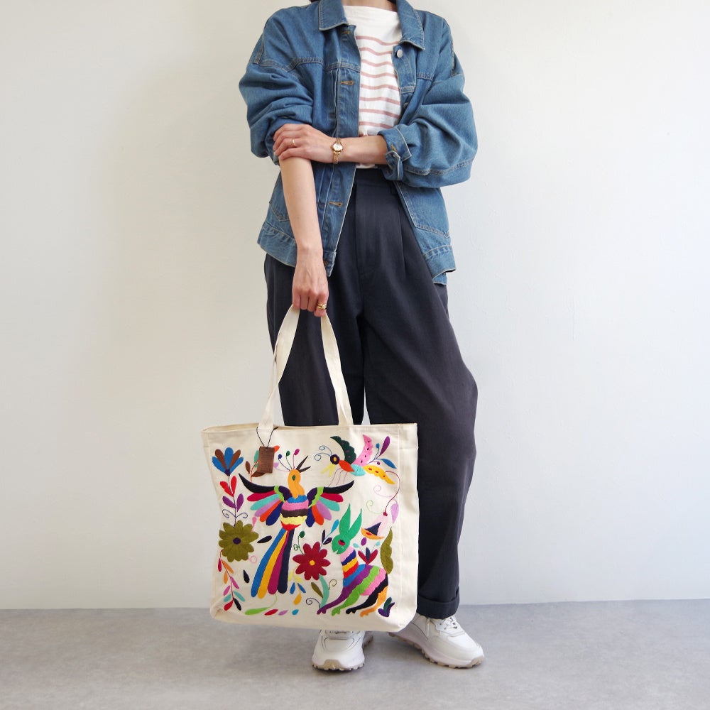 小花や小鳥など、メキシコでよくみられる身近な日常からインスピレーションを受け、たくさんの色や模様を使う刺繍は「オトミ刺繍」としてもよく知られています。