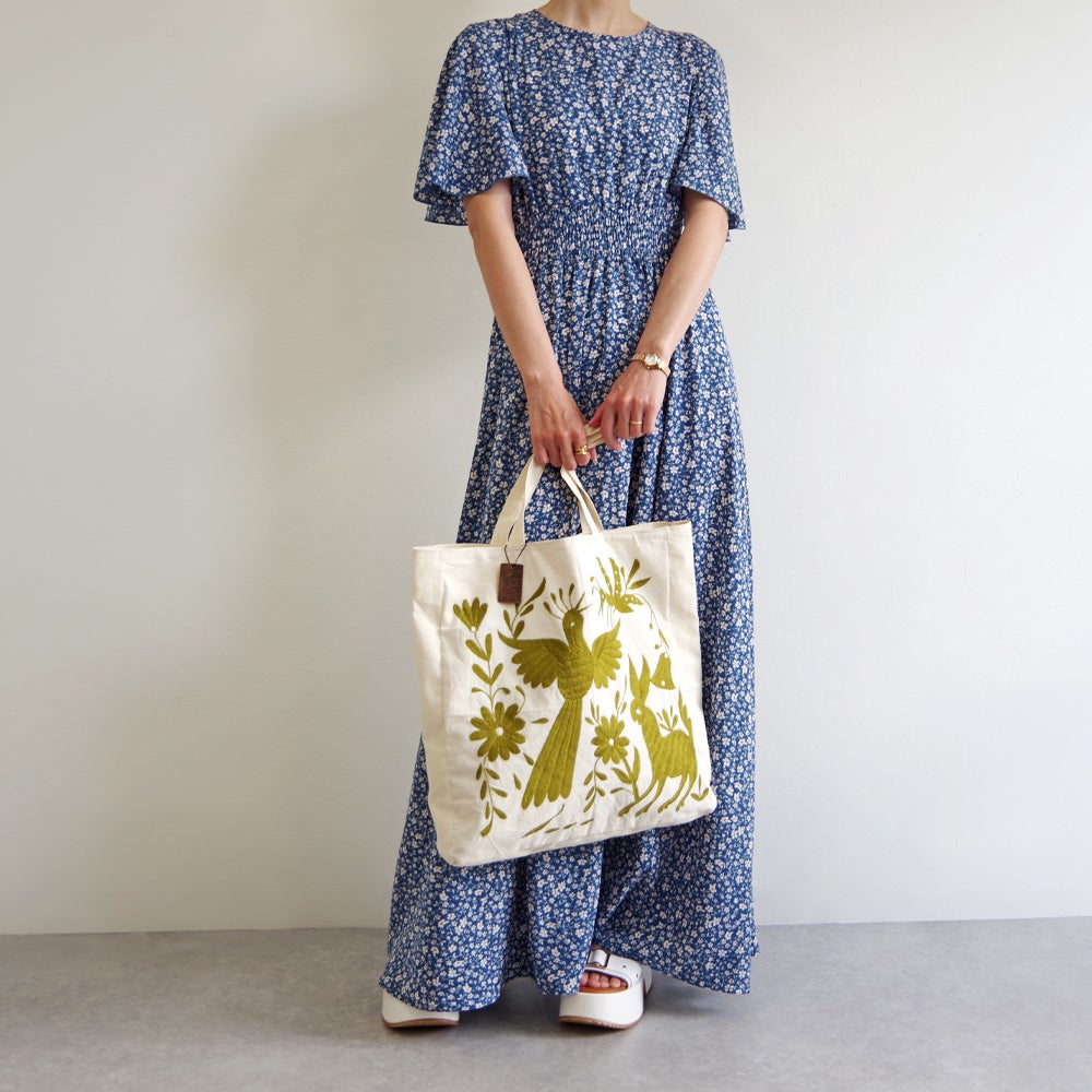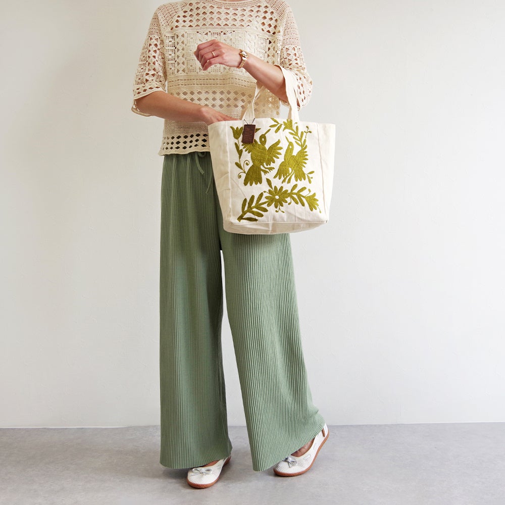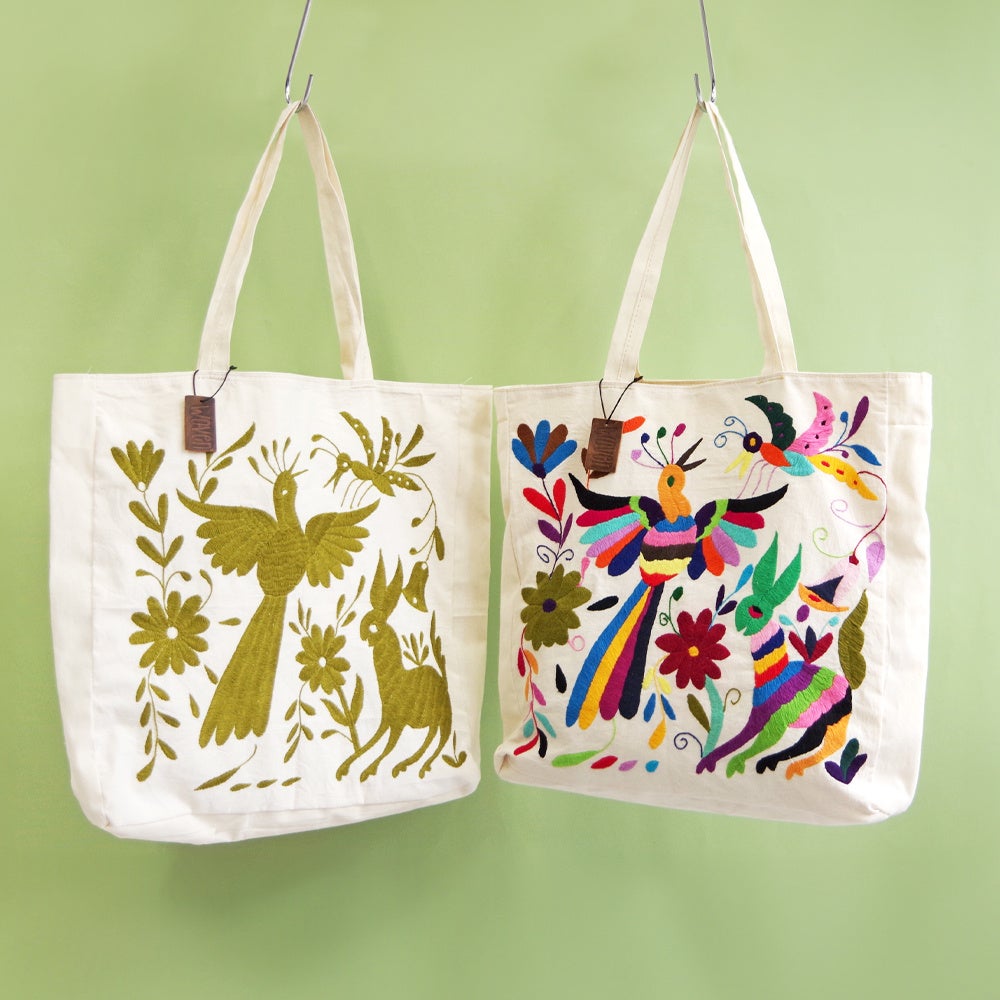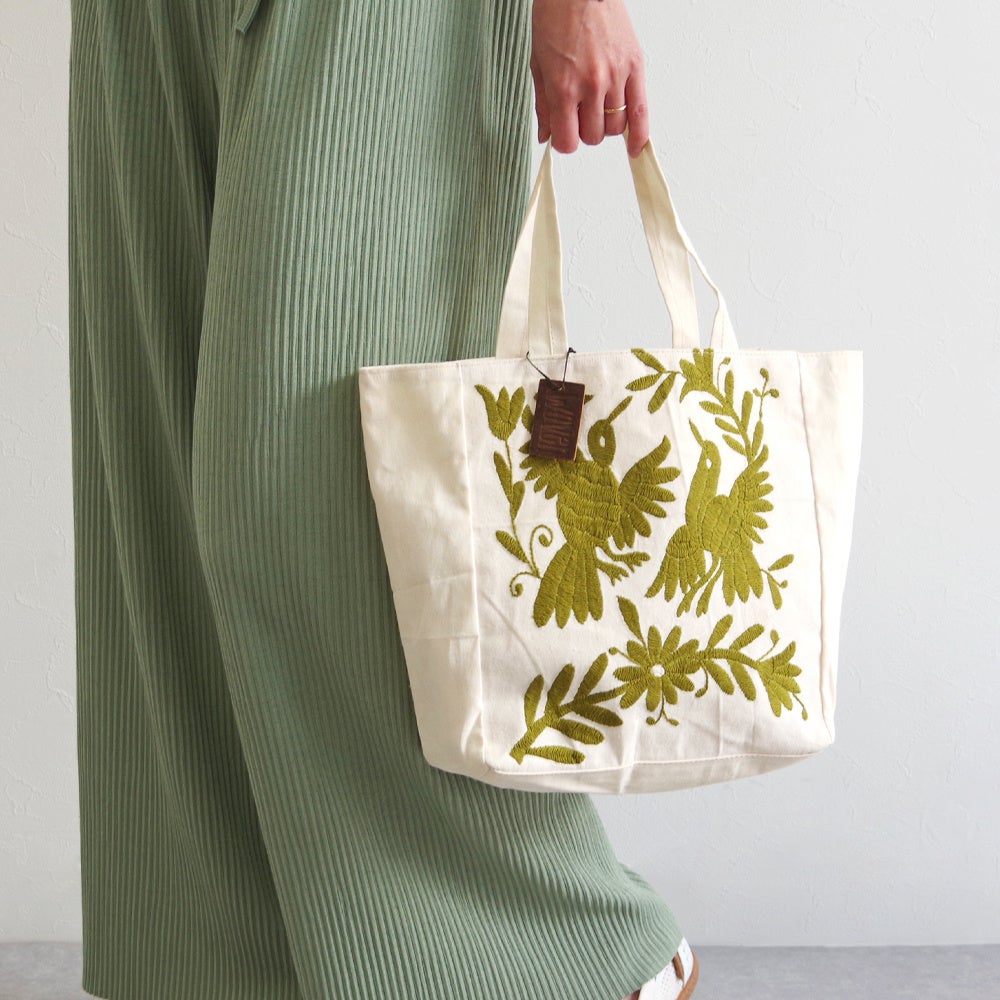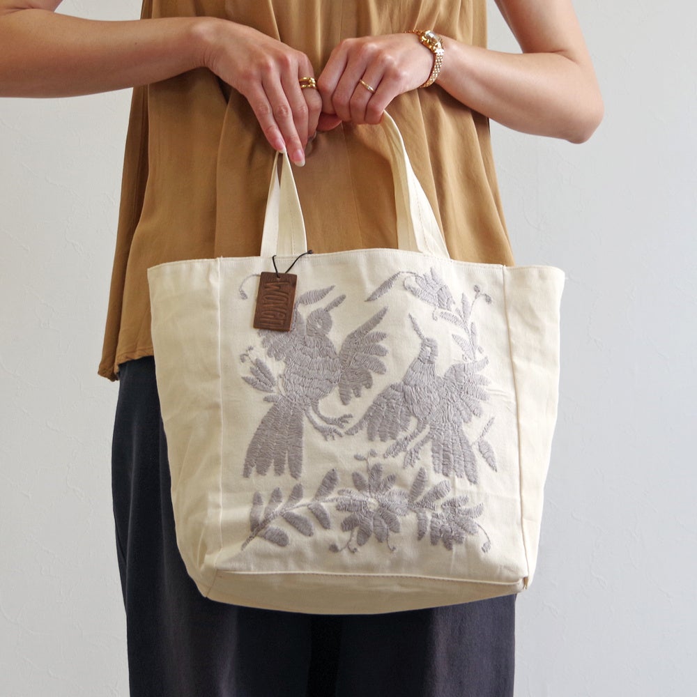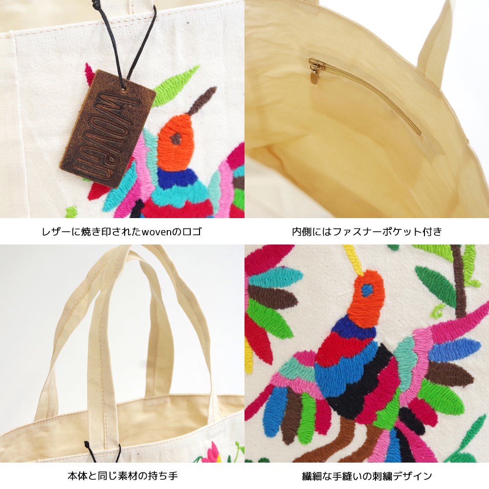 WOVENはメキシコでオトミ刺繍を受け継ぐ限られた職人さんと取り組み、オトミ刺繍の代表的なデザインながら一番難しいとされる、白い生地に複数の刺繍糸を施したデザインのバッグや使いやすい単色使いのバッグを展開します。