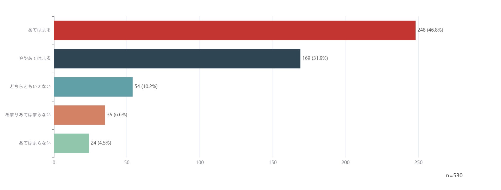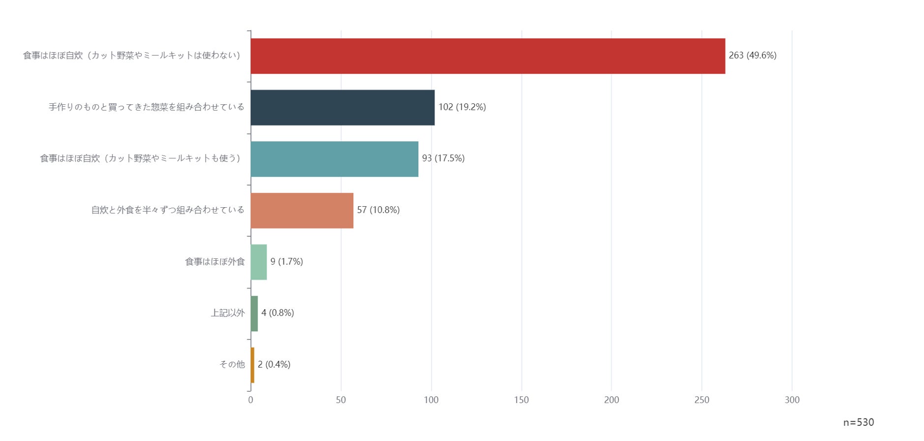 動物性食品以外では、「加工食品」を避ける人が最も多い結果となりました。これは下の質問の自炊率の高さともリンクしていそうです。次に、「グルテン」「油脂」「糖分」の順番で続きます。同時に「上記のいずれでもない」という方達も11%いるようで、プラントベースに関心のある方たちは、食に関して、自分たちの持つ基準をクリアしている限り、その種類にはフレキシブルである、とも言えるそうです。