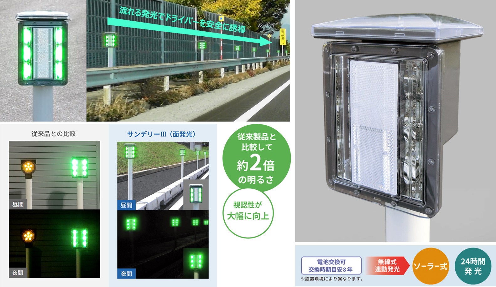昼、夜を問わず発生する交通事故に対し、24時間ドライバーの安全運転を支援することを目的に、遠方から気付きやすい大型面発光とドライバーの目線を引く流れる発光を組合せた「サンデリーⅢ」を開発しました。電源の確保が不要な太陽電池式としており「高速道路の渋滞解消」、「カーブ地点の視線誘導」、「中央分離部、分合流地点での注意喚起」などにご活用いただける製品です。