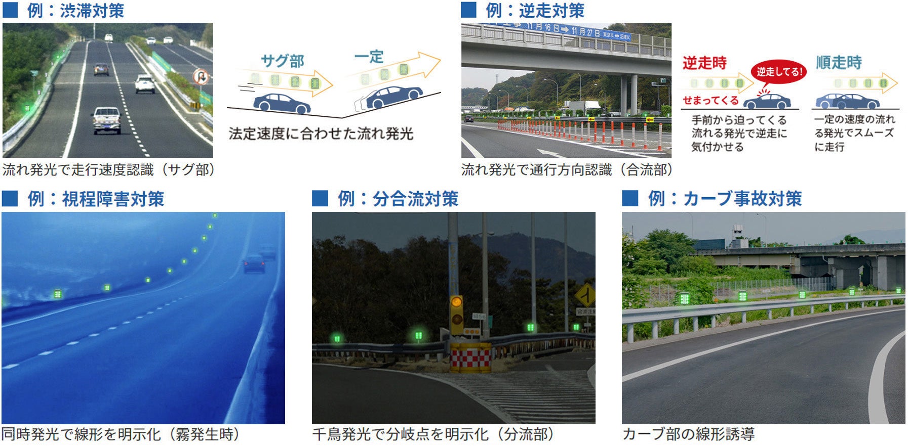 2.無線ユニットによる流れる発光で、高速道路の渋滞対策、カーブ線形の誘導、分合流地点の注意喚起などが可能です。
