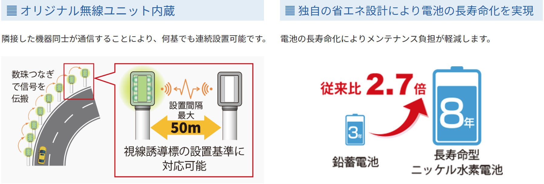 「サンデリーⅢ」は太陽電池で動作可能な省電力無線ユニットにより配線工事を不要としています。無線制御により「流れ発光」、「同時発光」、「千鳥発光」の3種類の連動発光が可能です。設置後も、専用リモコンにより現場で発光パターンの変更を可能で、通信を利用した遠隔制御を行えるオプションも設定しています。