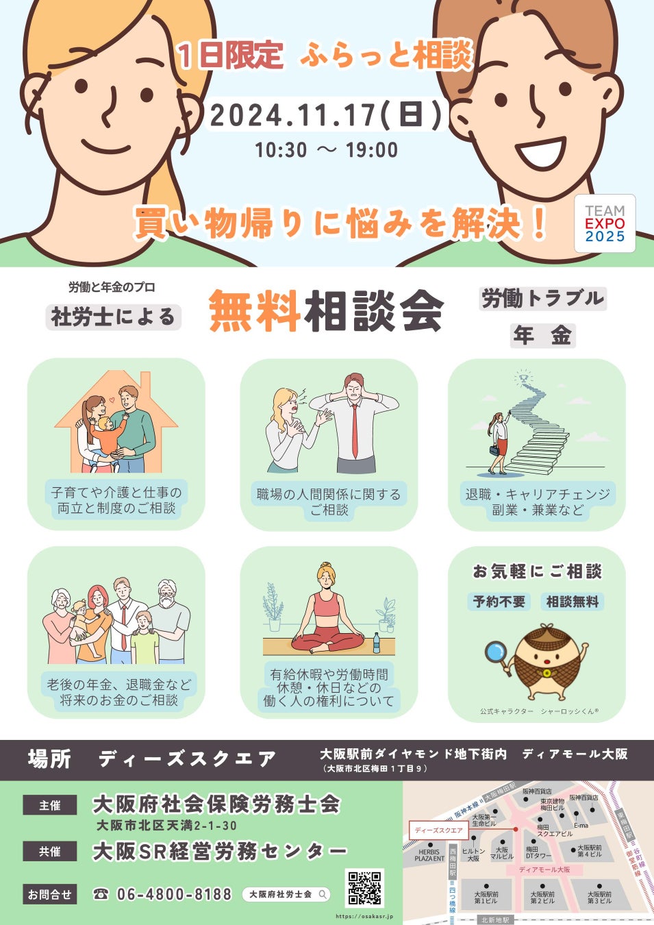 大阪府社会保険労務士会(大阪市北区 会長 大西宗明)は、令和6年11月17日(日)に「労働トラブル・年金無料相談会」を開催いたします。