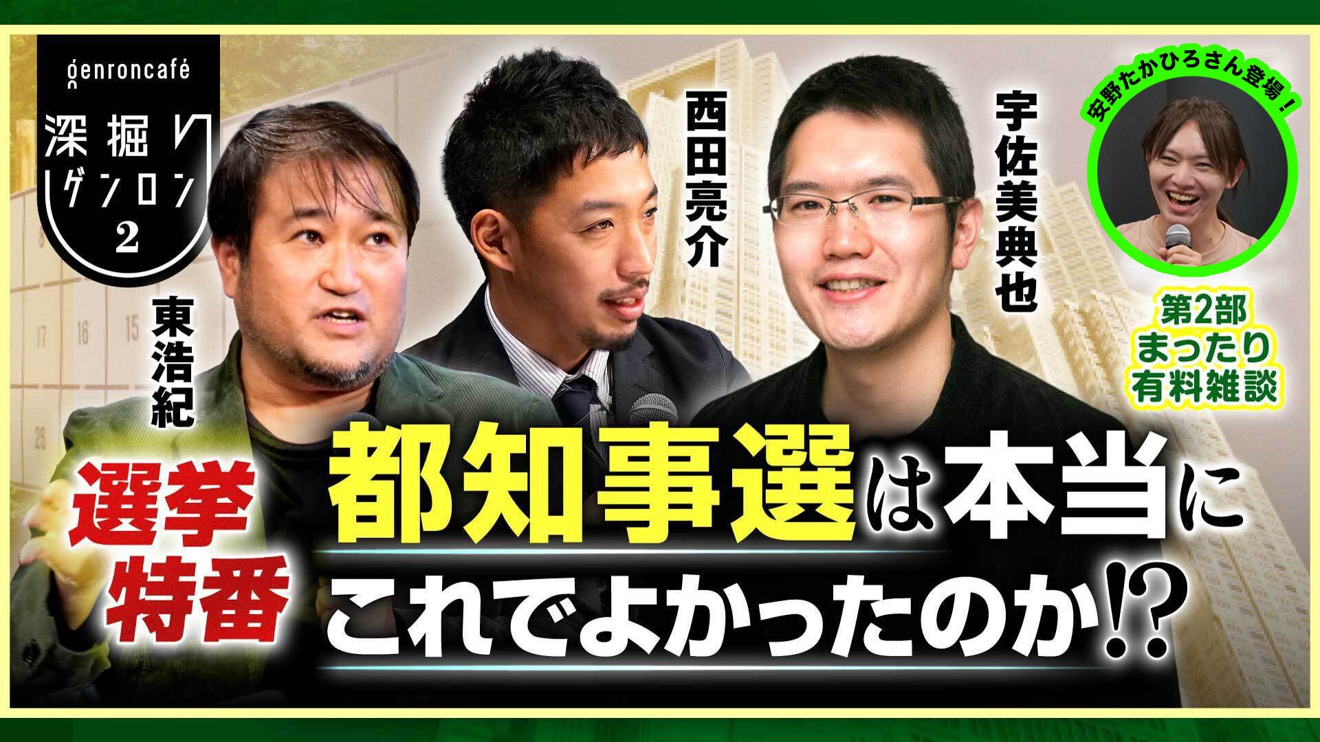 都知事選当日に開催した、宇佐美典也さんと西田亮介さん、東浩紀による選挙特番。放送中盤から選挙戦を終えたばかりの安野たかひろさんが2時間に亘り登壇。
