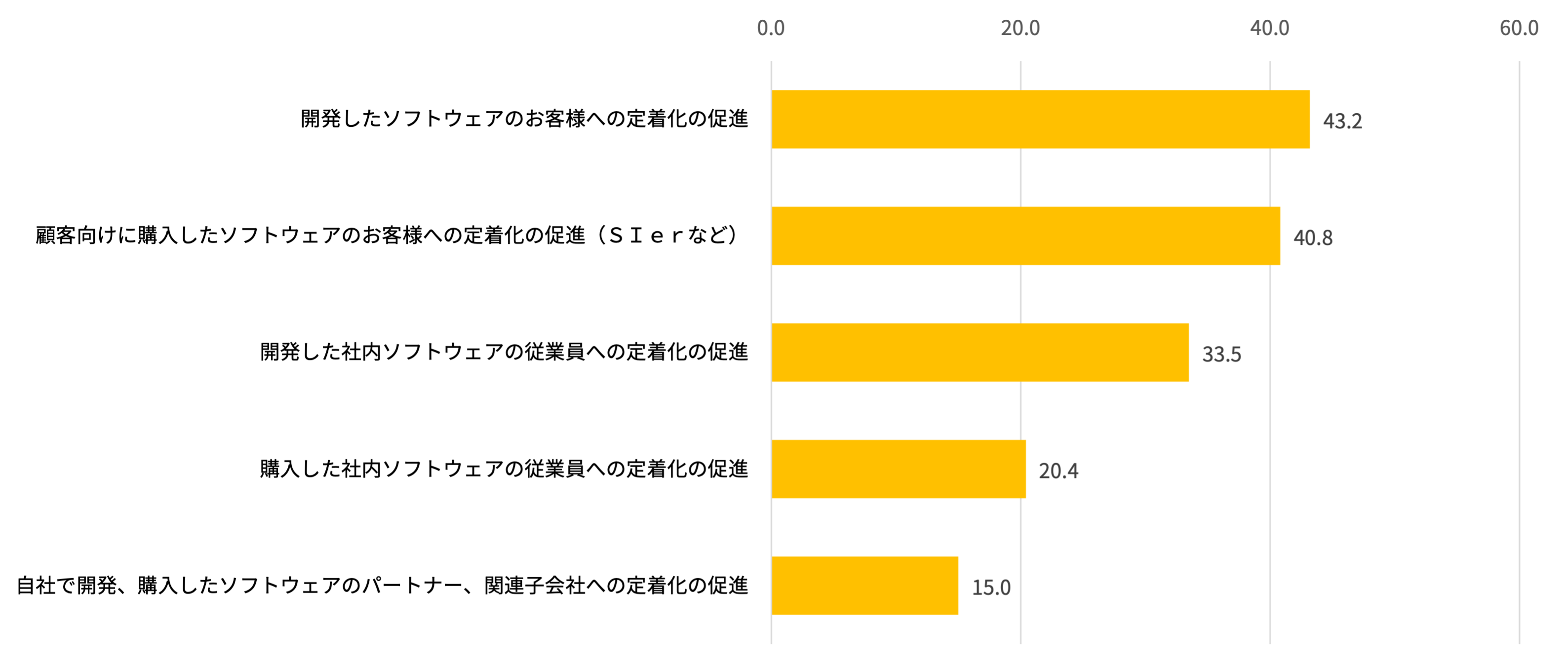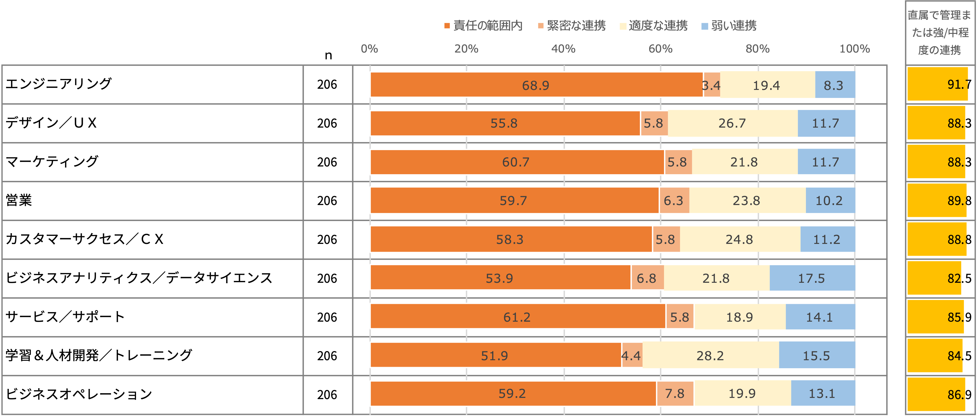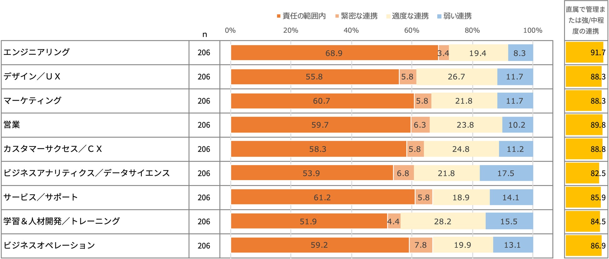 一方で、プロダクトマネージャーの担当分野において、「学習&人材開発/トレーニング」は自身の組織が責任を持って遂行する割合は51.9%と、その他の分野と比べるとやや低く、プロダクトの定着化は自部門以外の組織と連携して取り組む回答が半数程度となっています。加えて、プロダクトの定着化への関与に関しては、顧客向けプロダクトについては4割程度、従業員向けプロダクトは2~3割程度にとどまっており、ユーザーの利用・定着化は重要な成果指標となっているものの、関与度はそれほど高くない結果となりました。プロダクトの成功のためには、ユーザーがプロダクトやサービスを通じて得る利用・体験に対して、プロダクトマネージャーがこれまで以上に主体的に関与することが必要であると伺えます。