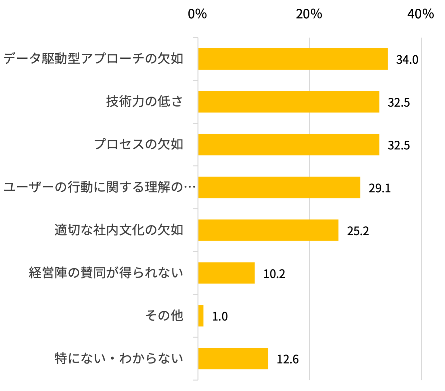プロダクトマネジメントを効果的に実⾏するうえでの課題点を調査したところ、「データ駆動型アプローチの⽋如」が34.0%と最も高い結果となりまし た。プロダクト開発においては⾃⾝の組織を「データ主導型」とした回答者の66.5%を占める⼀⽅で、データ収集・分析を基にしたプロダクトマネジメントを現状より加速させることが課題となっている企業もあることも判明しました。