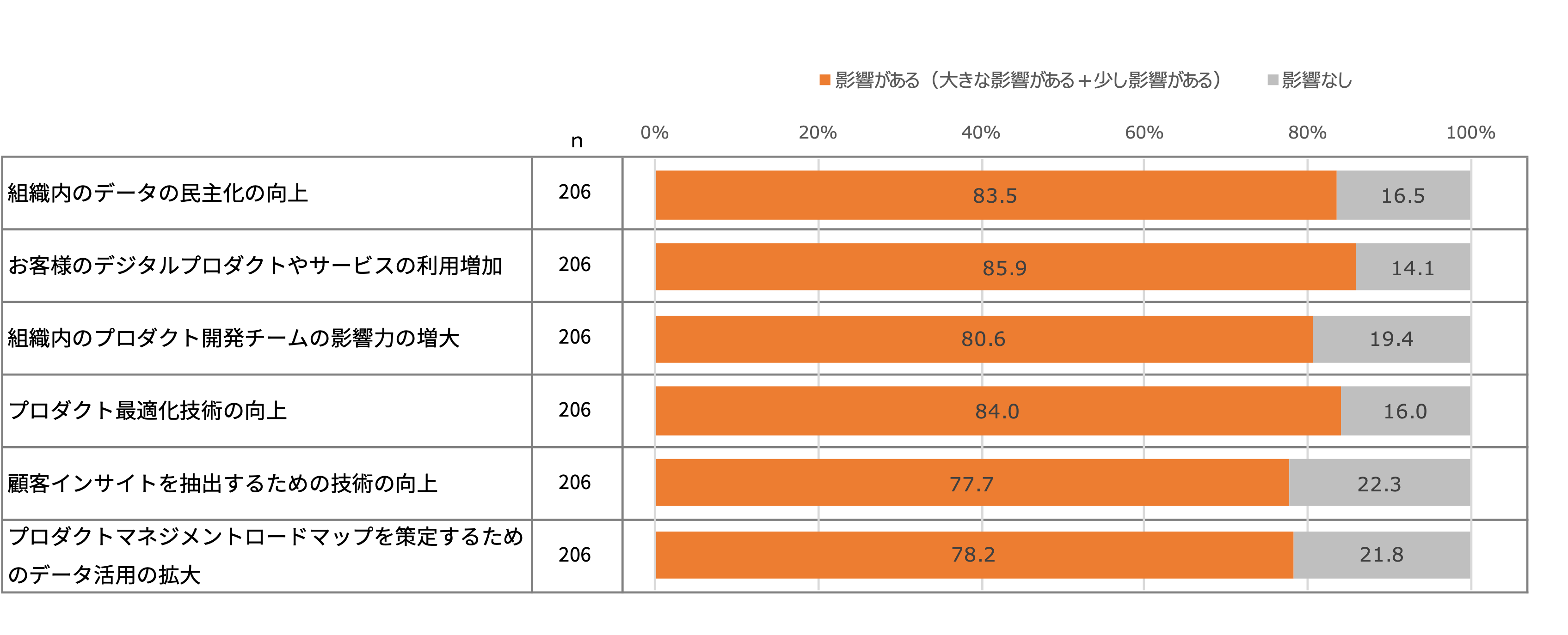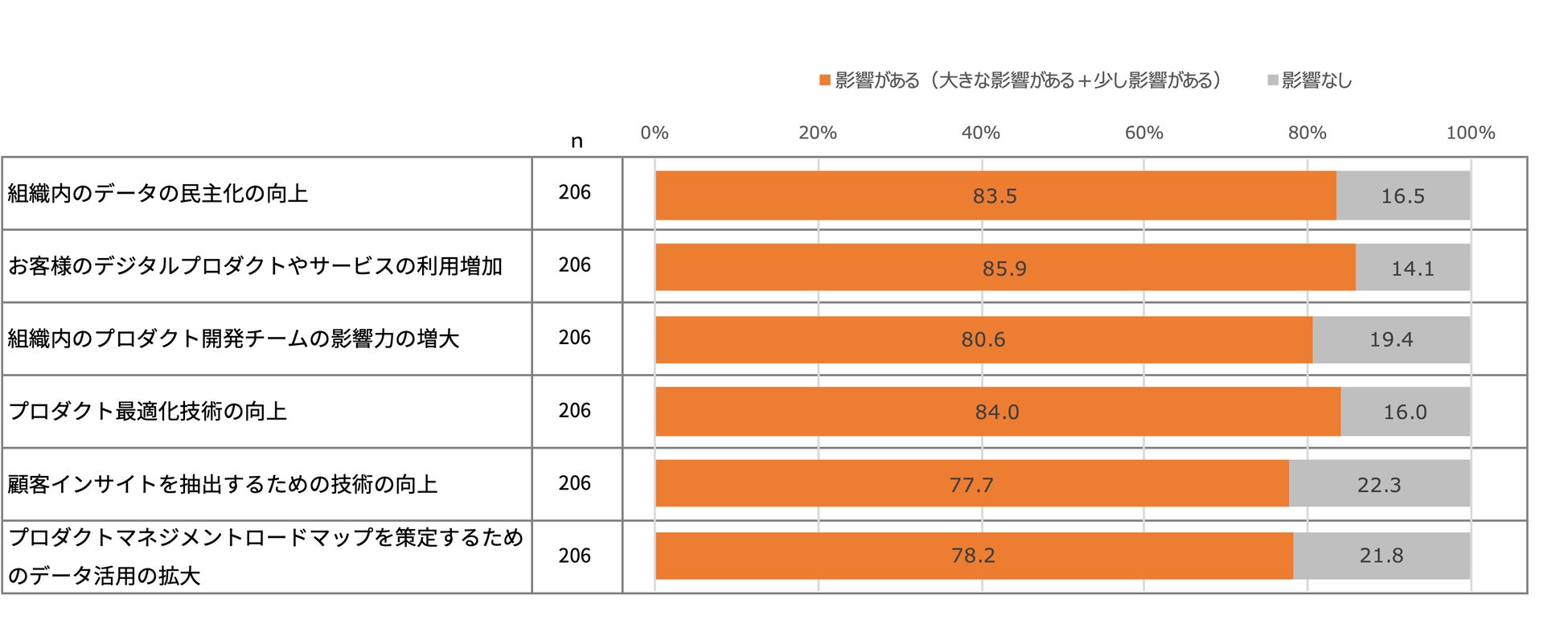 また、今後のプロダクトマネジメントに影響を与えると考えているトレンド・要素は、「お客様のデジタルプロダクトやサービスの利用増加」が85.9%で最も高く、プロダクトの成功のために、ユーザーの利用増加や定着化のための取り組みは、より重要性を増してくると見受けられます。
