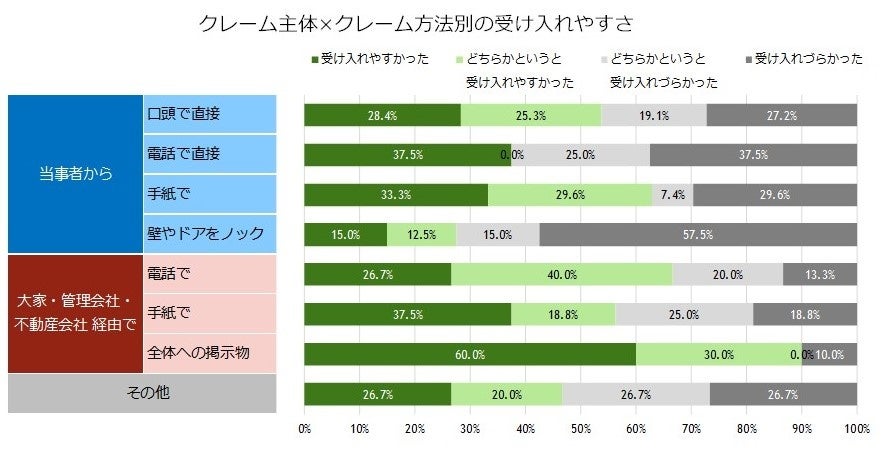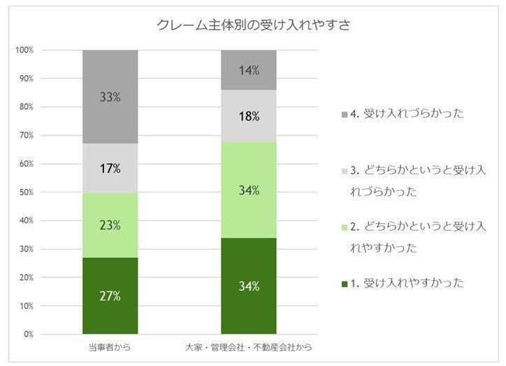 クレームの受け入れやすさについて、主体別に見ると、「当事者から」よりも「大家・管理会社・不動産会社から」の方が受け入れやすそうです。当事者からのクレームは、「受け入れやすかった」と「どちらかというと受け入れやすかった」をあわせて50%なのに対し、大家・管理会社・不動産会社は68%でした。