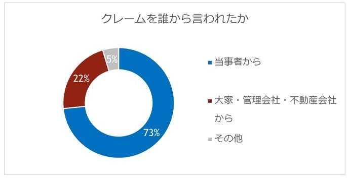 クレームの主体について確認すると、7割以上が「当事者から」と回答しました。大家・管理会社・不動産会社からが約2割で、その他が5%でした。その他の中には「110番で警察の方から」「理事長から」「知人を通じて」などの回答がありました。