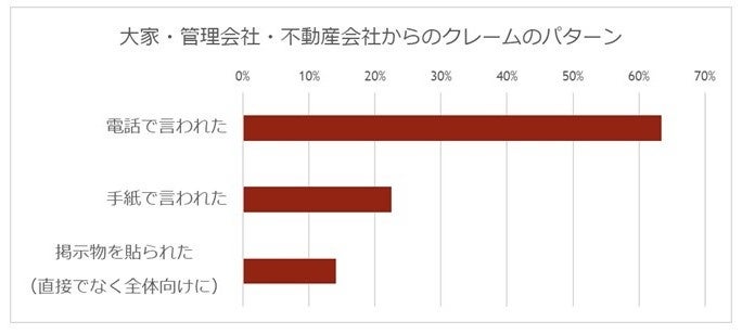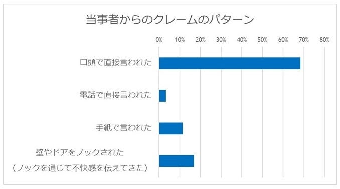 注意の受け方について確認すると、当事者からのクレームでは「口頭で直接」が約7割で最も多く、ついで「壁やドアのノック」が約2割、「手紙」が約1割でした。