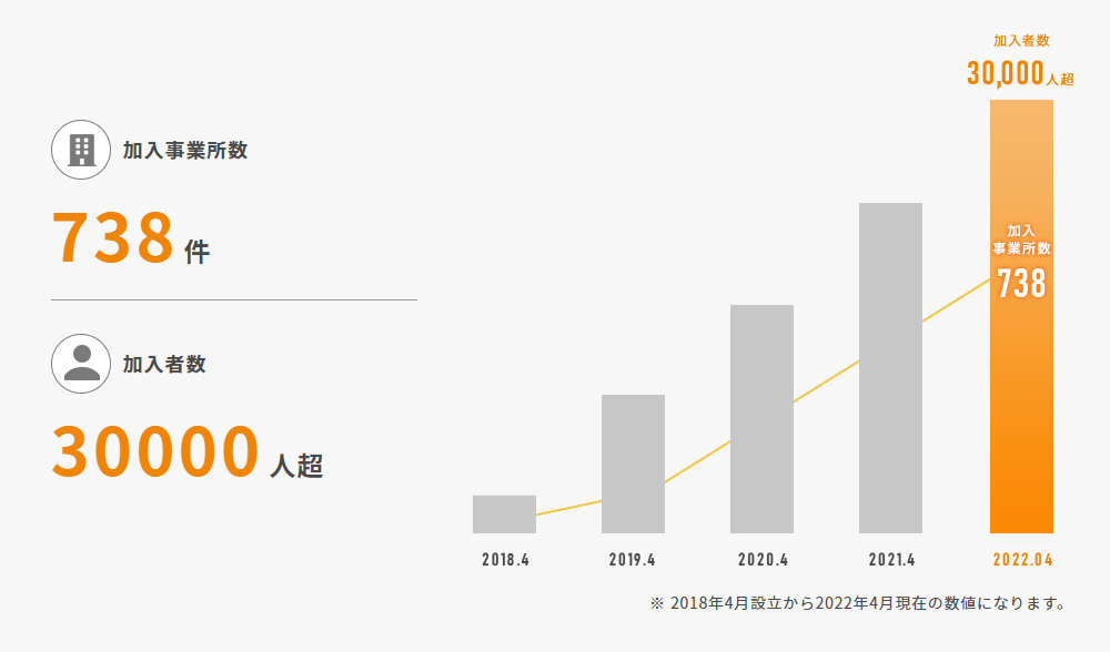 基金設立後わずか4年間で、加入事業所数738、加入者数が約18倍の30,085人(2022年4月末現在)となりました。急成長をとげている理由として、導入法人にとって安心安全な仕組みや充実したサポート体制を提供していることと、加入者が元本保証で安心して積立ができ、かつスマホひとつで簡単に手続きができることが挙げられます。「はぐくみ基金」を導入した事業主の従業員の平均加入率は65%を超え、非常に高い加入率となっています。