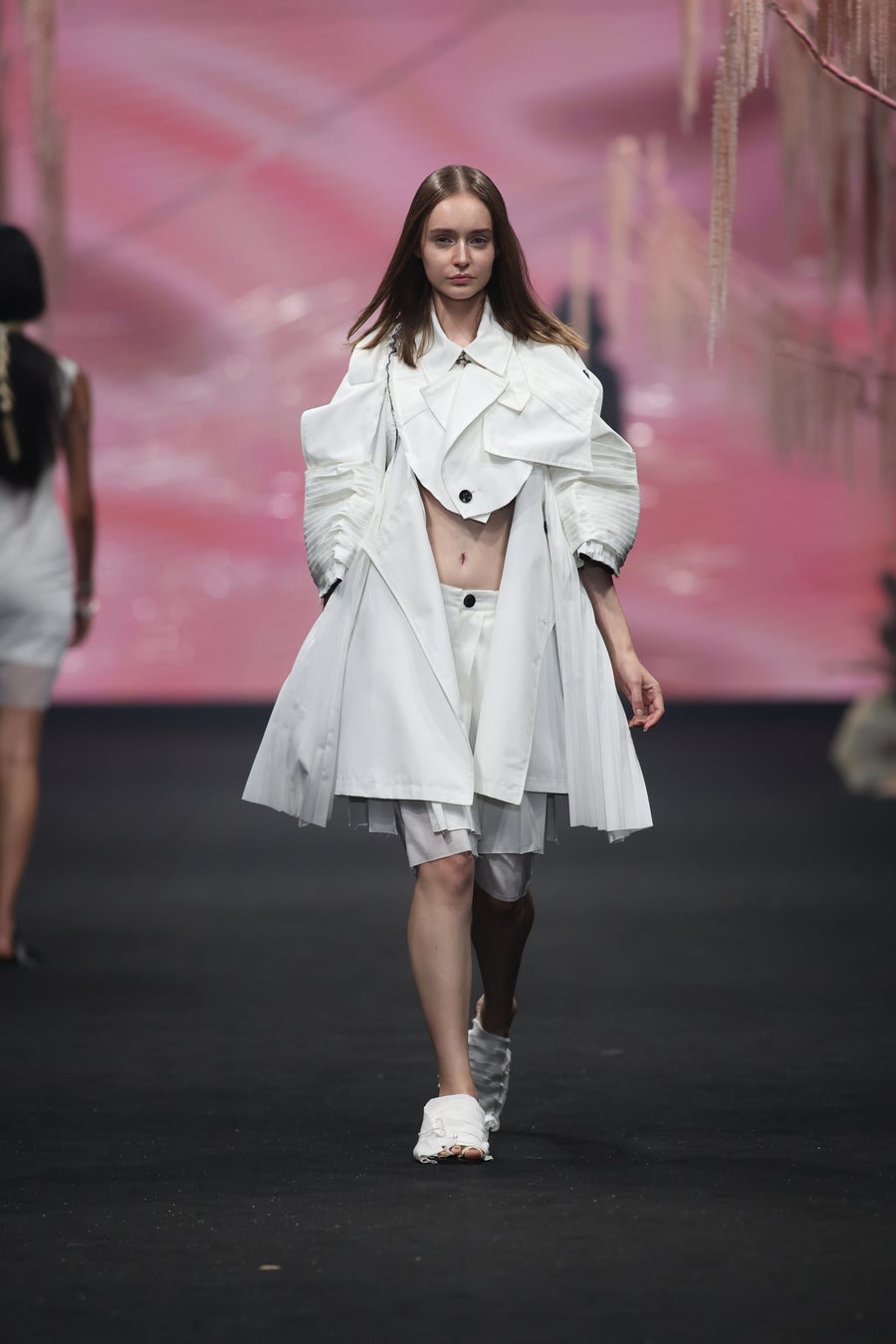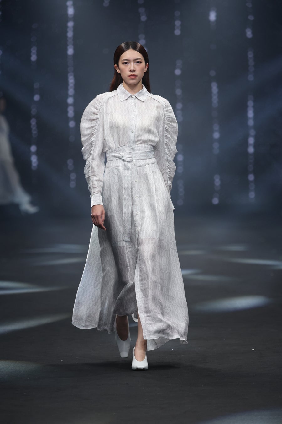 今シーズンは「TRACES 痕跡」をテーマに、女性の成長過程を探求し、女性には常識を覆し打ち破る力があることを強調しました。デザインはクラシックなトレンチコートのシルエットを再構築し、またさまざまなプリーツ技術をジャケットやスカートに取り入れました。女性の優雅さや強靭性を示しました。