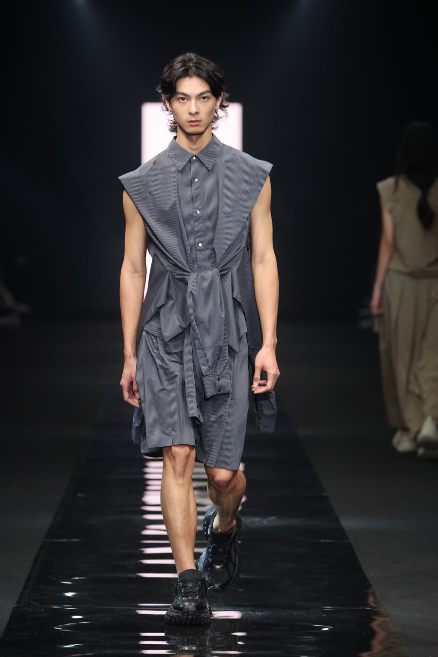 #DAMURの2025春夏コレクションは、ジェンダーに対する固定観念を再構築し、自己認識を強調することで、男性、女性の伝統的なイメージを再定義することを目指しました。デザインでは、カットアウトや波状のパターン、多層構造を取り入れ、ジェンダーレスファッションの可能性を表現しました。