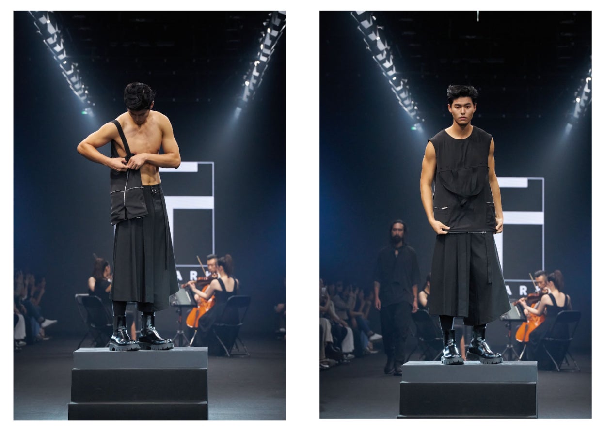 今シーズンの「K-U-O-W-E-I」コレクションは、デザイナーである郭瑋氏の脳のCT写真をプリントにしています。また数点の「マルチウェイ」アイテムを発表し、10秒でトップスに変身するトートバッグなど、ウェアの多様性と持続可能なファッションを呼応させました。