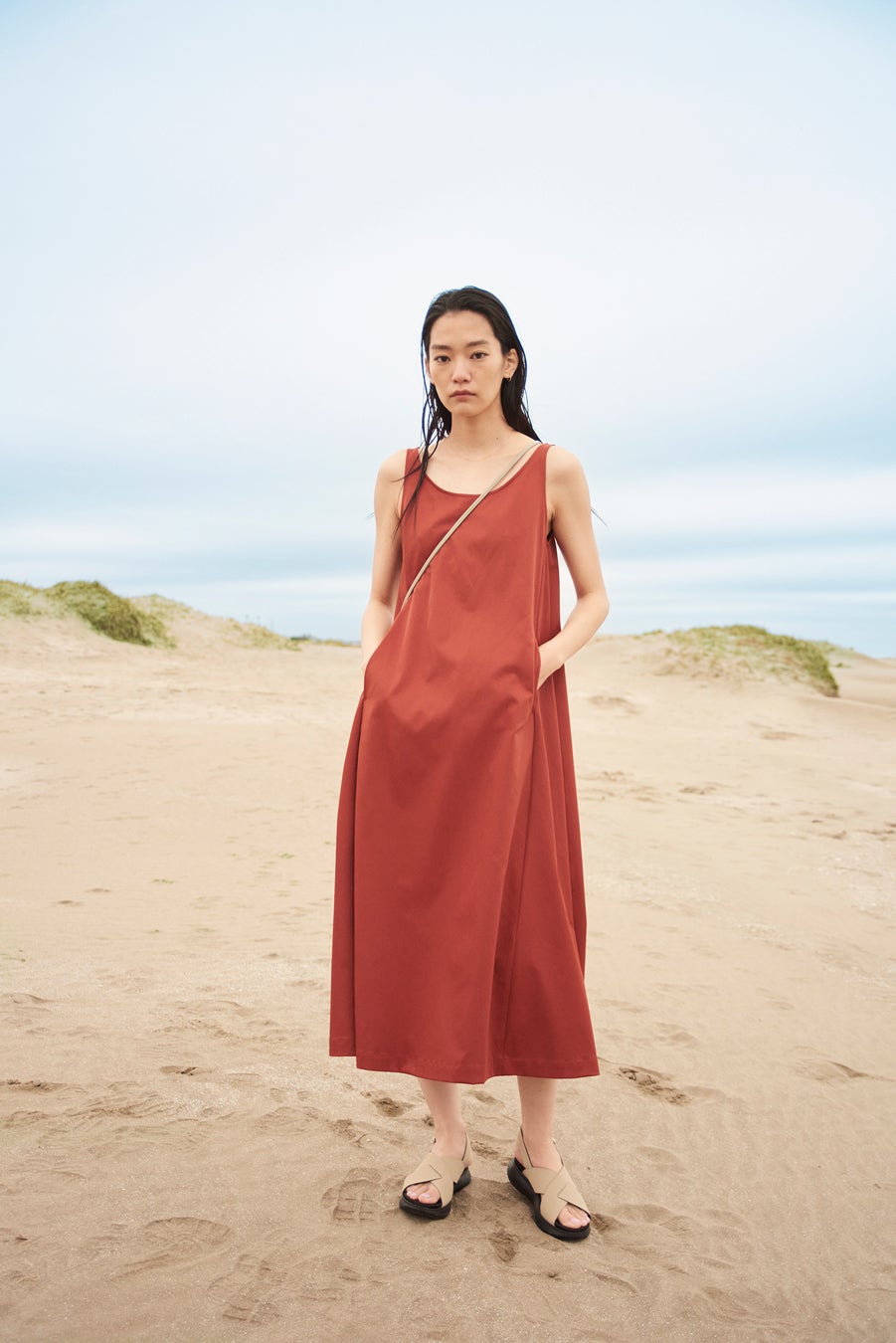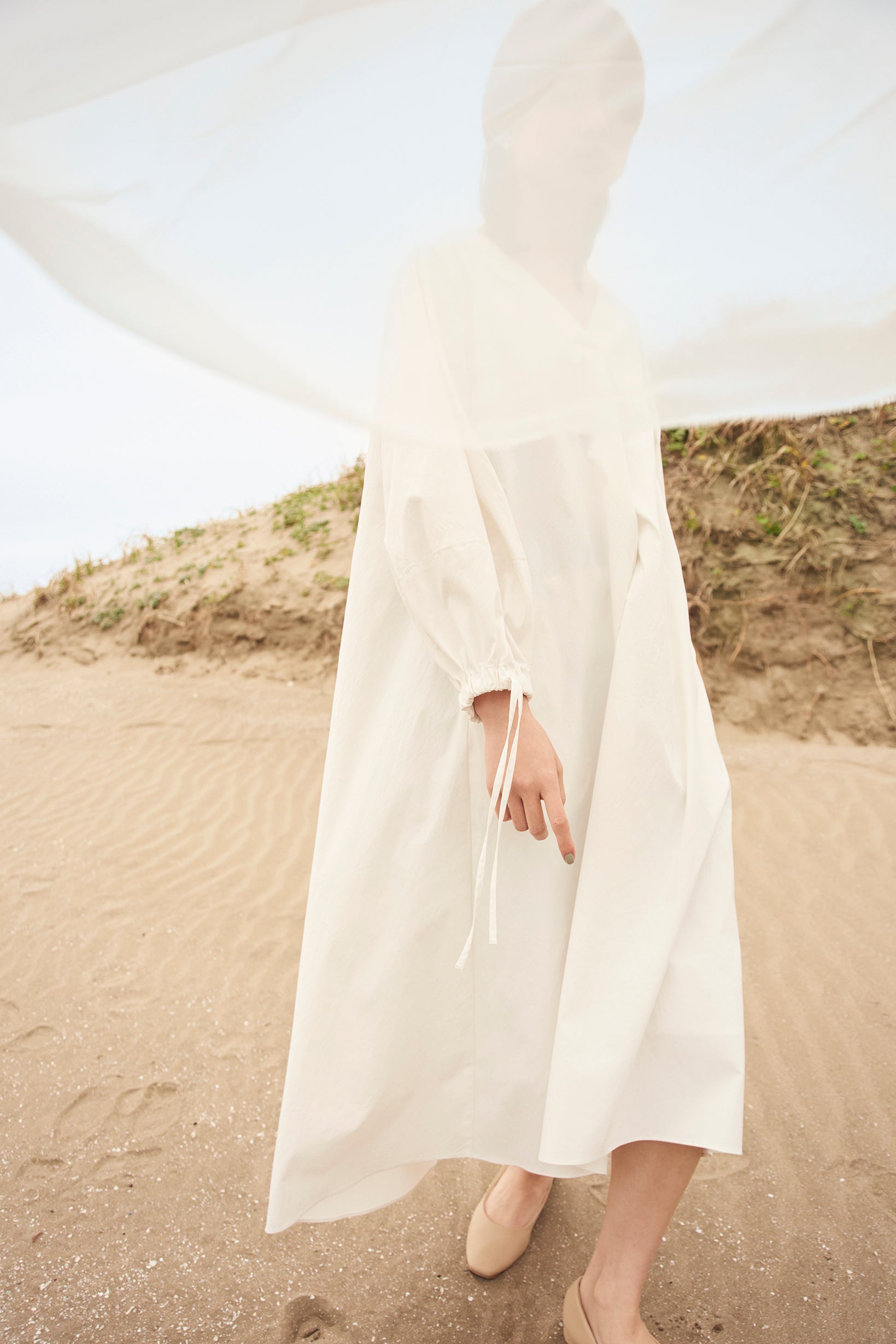 従来から一般的に使われており、環境と身体への有害な影響が危惧されているPFC(過フッ素化合物)を使用していないはっ水加工を施し、裾やアンブレラヨークにギミックを効かせたデザインが特徴のROUND HEM TRENCH COAT、そしてコートと同素材を採用したレイヤードデザインが特徴のASYMMETRICAL SKIRT、主要素材にペットボトル由来のリサイクルポリエステルを約62%使用した、ドライな着用感とボリュームのある袖が魅力のLONG SLEEVE DRESSと、Vネックとラウンドネックの前後2WAY仕様の速乾性とストレッチ性を備えたFLARE TANK DRESSなどのモダンな佇まいのアーバンウエアがラインナップ。