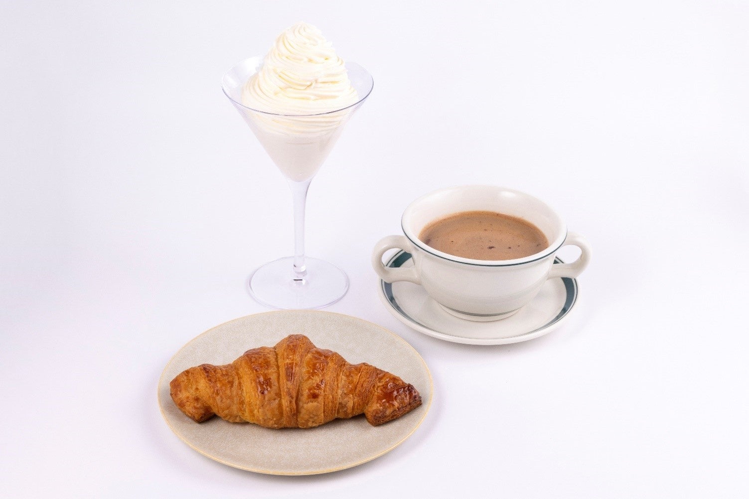 看板メニューは、ホットチョコレートにコーヒーを入れたショコララテ、クロワッサン、生クリームをセットにした「モカ・ショコラショー」。クロワッサンをショコララテにディップしたり、ホイップをつけたりしながら自由に味わうことができます。ホットチョコレートには、コロンビアを拠点とするチョコレートブランド「カカオハンターズ」のチョコレートフレークを使用しています。