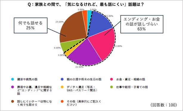 ・一方、“気になるが最も話しにくい話題”の1位はエンディングとお金(44%)、次いで介護(16%)といった将来テーマで、6割がもしもの話を避けている実態が明らかになりました。