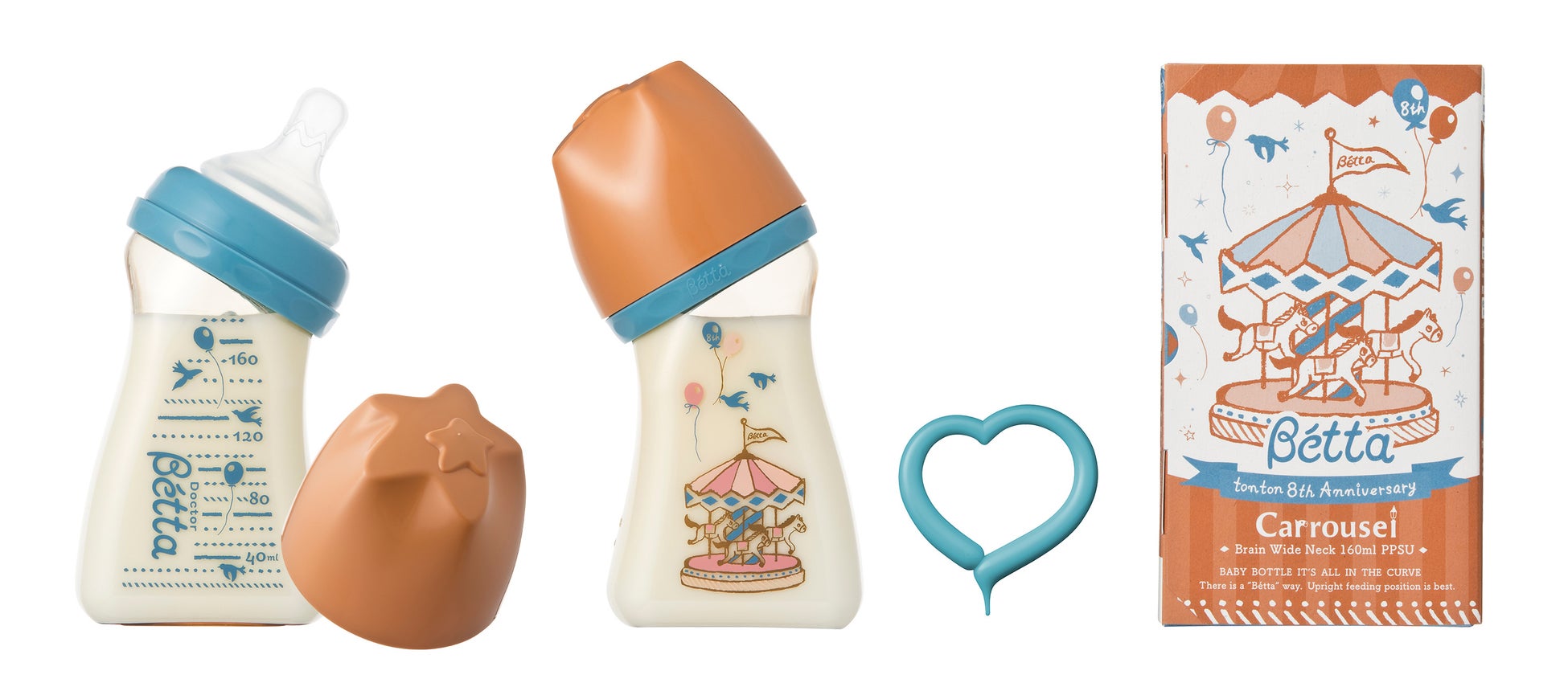 小児科医が考案した独自のカーブが特徴のドクターベッタ哺乳びん。表参道のベッタ直営店「Bétta tonton」の8周年を記念して、人気のメリーゴーランドデザインの哺乳びんを5月27日に発売いたします。