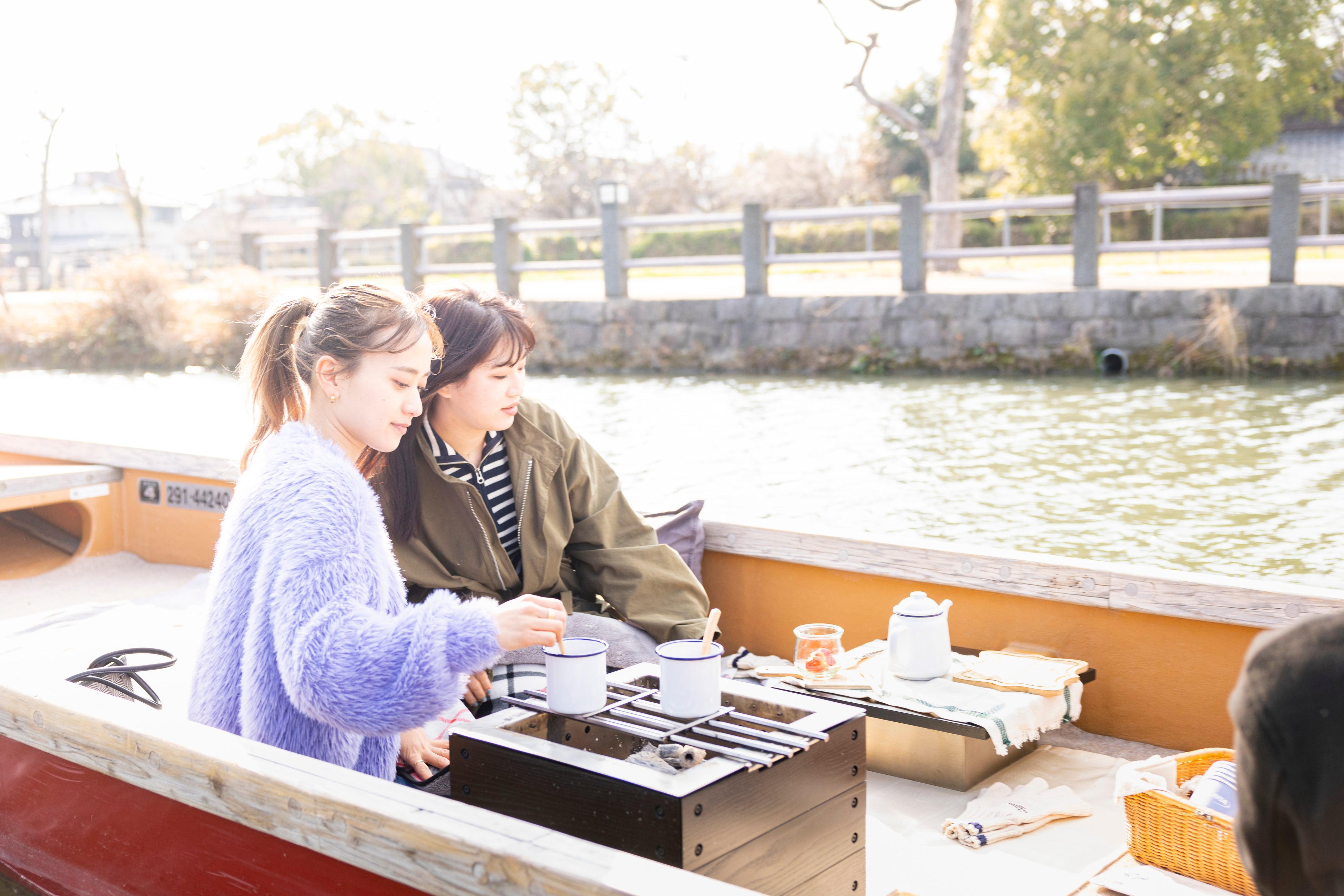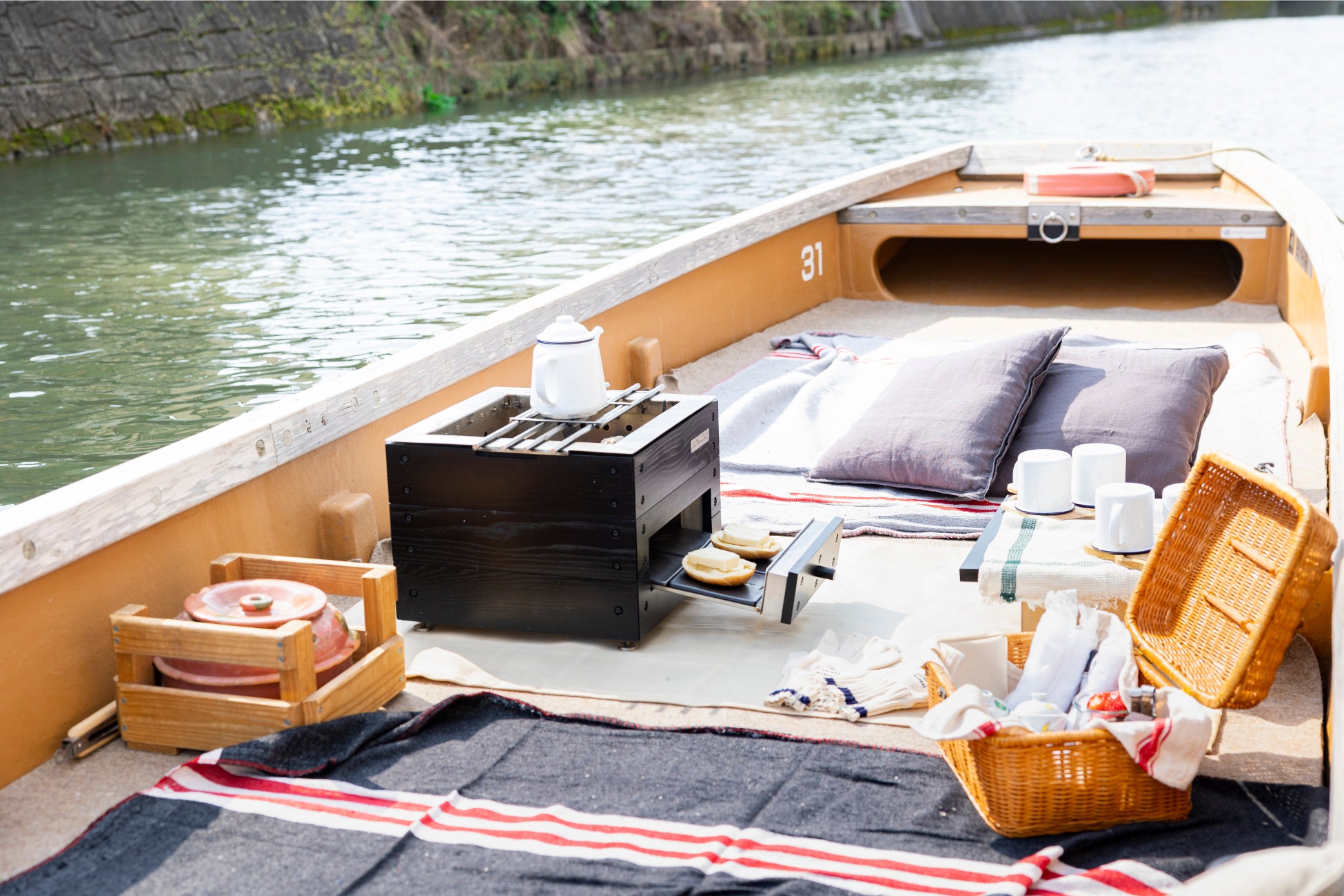 舟の上でアウトドアグリルを使い、柳川の美味しいパンを焼いたり、ホットミルクを楽しんだり。思い思いに過ごせます。
