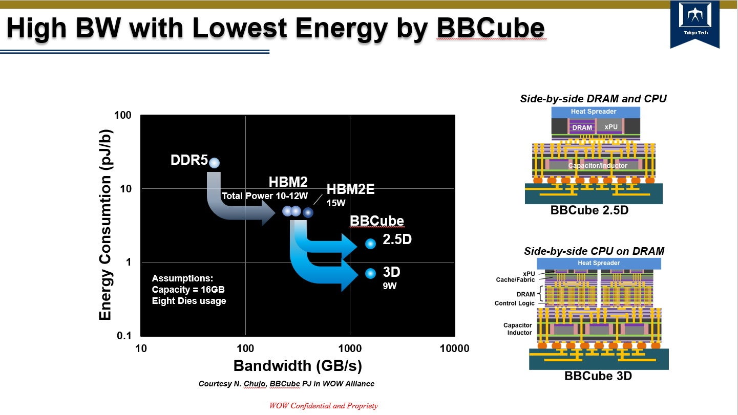 WOWアライアンスでは、ウエハーを従来の20~30μmから、4μmまで超薄化する独自の「ウエハー薄化技術」、バンプを用いずTSV配線する「バンプレス配線技術」、高密度超並列配線による「テラバイト高帯域伝送」をWOW(Wafer on Wafer)やCOW(Chip on Wafer)の積層に適用することで、三次元大規模集積技術「BBCube」を確立しています。そして、この技術を進化させることで、半導体システムを1000分の1に超小型化し、消費電力は1000分の1以下にすることを目指して、研究開発を進めています。