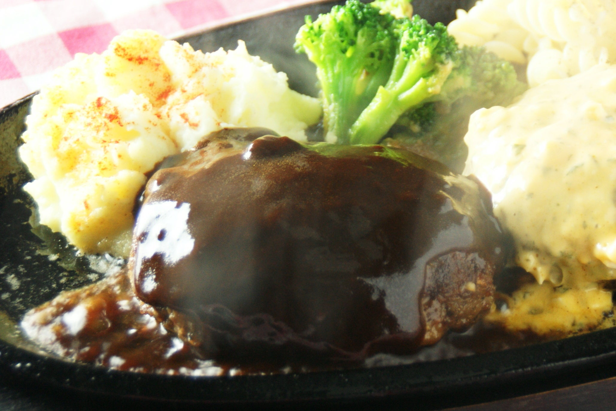 国産牛100%のハンバーグは肉の味をしっかり感じ、まるで柔らかいステーキを食べているかのような肉肉しさもたのしめます。